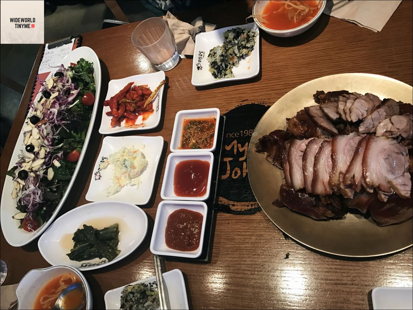 เมื่อไม่มีอะไรให้รอดูแล้ว เราหนีความอกหักไปหาของกินที่ย่านฮงแด ซึ่งแอรี่ผู้วางแผนการเที่ยวครั้งนี้่ก็บอกว่าเราต้องไปกิน ขาหมูของเกาหลี ที่เรียกว่า จกบัล ให้จงได้ โดยร้านที่เราต้องไปกินคือร้านชื่อ Myth อยู่ในย่านฮงแดนี้แล และตอนเราไปถึงก็มีคนนั่งเข้าคิวกันอยู่แล้ว และพอเอาไปรับคิว พร้อมมองดูหน้าจอที่แสดงคิวก็พบว่าอีกตั้ง 20 กว่าคิวกว่าจะถึงเรา พวกเราเลยไปเดินดูของแถวๆนั้นก่อน เพื่อพบว่าเมื่อเรากลับมา คิวจะรันข้ามเราไปแล้วอย่างชวนงง เพราะเราไม่ได้หายไปนานถ้าเทียบกับจำนวนคิวก่อนหน้าเรา