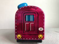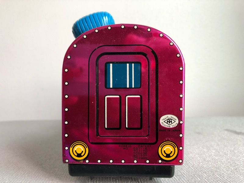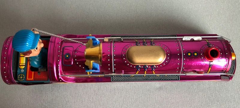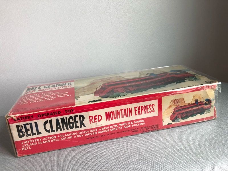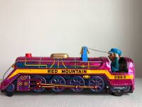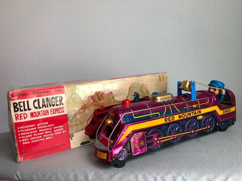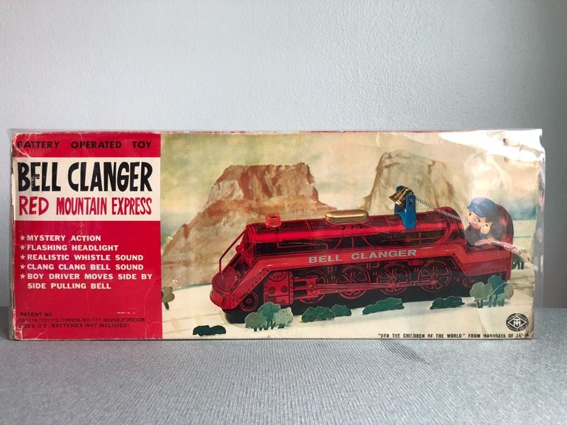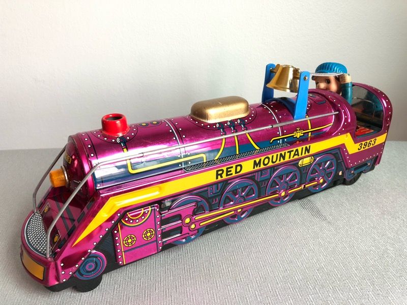 รถไฟสังกะสีที่ผมเคยมีนี้ แม่บอกว่าแม่ไปซื้อให้ที่คลองถม ราคาประมาณ 150 บ. แต่นั่นก็คือราคาในยุค 70 ปลายๆไง... รถไฟหน้าฝรั่งคันนี้ไม่ใช่ของยุโรป เยอรมัน แต่อย่างใด มันผลิตในญี่ปุ่น ในชื่อแบรนด์ modern toy หรือชื่อญี่ปุ่นคือ Masudaya ซึ่งเป็นบริษัทของเล่นกลไกที่เก่าแก่ ผลิตรถไฟรุ่นนี้จำหน่ายในปี 1970 โดยใช้แบบจากรถจักรไอน้ำของอเมริกา โดยตั้งชื่อให้เข้ากับอิมเมจของรถไฟข้ามรัฐ ที่สองข้างทางมีแต่ภูเขาใหญ่ๆ เช่นคันนี้ ชื่อ red Mountain ถ้ารถสีฟ้า ก็ชื่อ blue Mountain สีเงิน siver mountain เป็นต้น จำไม่ผิดของผมเป็น Piston siver mountain ซึ่งรายละเอียดจะต่างกันตรงที่ไม่มีกระดิ่งแต่จะเป็นแผงลูกสูบแทน ใส่ถ่านก้อนใหญ่ๆที่เด็วนี้หาไม่ค่อยได้ 3 ก้อน เปิดสวิตซ์แล้วมันก็วิ่งไปมาไร้ทิศทางตามการหมุนของพวงล้อ ชนแล้วถอย แล้วเด็กผู้ชายก็สั่นสายระฆังตามการโยกตัวไปมา