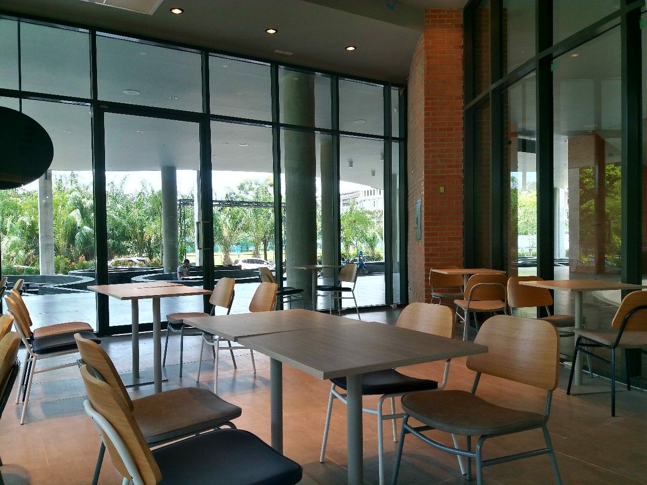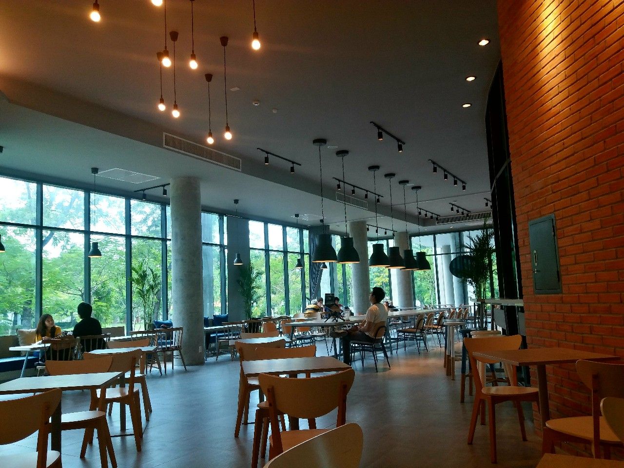 ภายในร้าน URBIE ได้รับการออกแบบให้มีกระจกโดยรอบ ดังนั้นเราจะเห็นบรรยากาศ และสิ่งแวดล้อมอันเขียวขจีรอบ ๆ ร้านได้ ระหว่างที่เราทำงานหนัก ๆ การได้นั่งพักชมธรรมชาติสีเขียวถือว่าเป็นสิ่งที่ดีนะครับ และขอบอกไว้ก่อนเลยว่าในร้านนี้ มีมุมถ่ายรูปสุดติสท์เยอะเหมือนกัน เพราะผมเองก็ถ่ายมาไม่น้อยด้วย และด้วยความที่ร้านนี้อยู่ใต้ตึกคณะฯ ที่ได้รับการออกแบบให้มีพื้นที่แบบ Open Air ดังนั้นทำให้เราได้เห็นธรรมชาติรอบ ๆ ตึกมากขึ้นอีกด้วย ไม่ว่าจะเป็นต้นไม้ สนามหญ้า หรืออยากจะออกไปให้อาหารปลาคราฟก็ทำได้ด้วยนะครับ (ถ้ามีคนช่วยคุณเฝ้าของ)