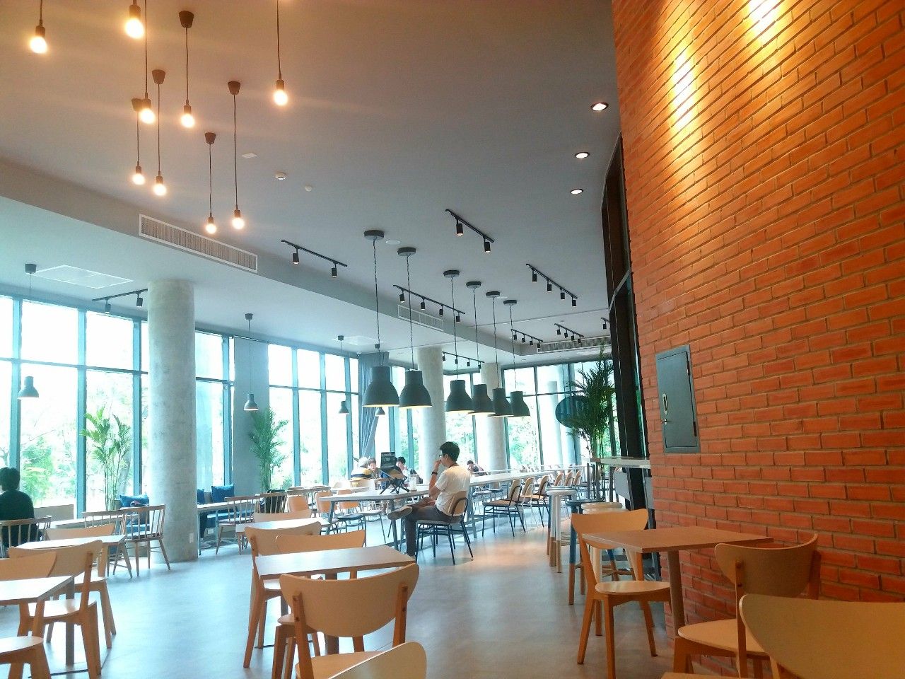 ส่วนโต๊ะนั่งที่นี่จะมีรูปแบบหลากหลายครับ ตั้งแต่โต๊ะแบบมาตรฐานสำหรับนั่งติว นั่งทำงาน นั่งคุยกับเพื่อน หรือแม้กระทั่งแบบโซฟาไว้นั่งคุยกันแบบสบาย ๆ พร้อมวิวธรรมชาติสวย ๆ ด้านหลัง หรือถ้าอยากสบายกว่านี้ ก็มีเก้าอี้แบบ Bean Bag ไว้ให้ได้นั่งชิลล์ ๆ อีกด้วย หรือถ้าใครต้องการความสงบ รับลมธรรมชาติ ก็สามารถไปนั่งในที่นั่งในบ่อปลาคราฟด้านหน้าคณะได้ด้วยเช่นกันครับ