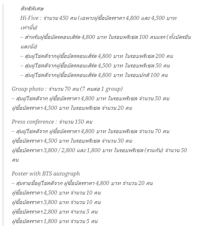 เมื่อเราขออนุญาตได้แล้วเรากับน้องเลยมาคุยกันค่ะว่าสรุปเราจะไปบัตรเท่าไหร่ดี ยืนหรือนั่ง คุยกันไปกันมาสรุปหวยออกที่บัตรแพงสุดราคา 4800 ค่ะเพราะเราสองคนคิดว่าจะไปทั้งทีก็เอาให้คุ้มเห็นชัดๆกันไปเลย ซึ่งบัตรราคานี้มีสองแบบค่ะคือบัตรนั่งและบัตรยืน แต่.. ด้วยความที่เราสองคนเป็นคนตัวเล็ก(?)เลยเลือกไปบัตรนั่งค่ะ และทางผู้จัดเขามีสิทธิพิเศษให้เราลุ้นด้วย เงื่อนไขก็เป็นแบบนี้ค่ะ