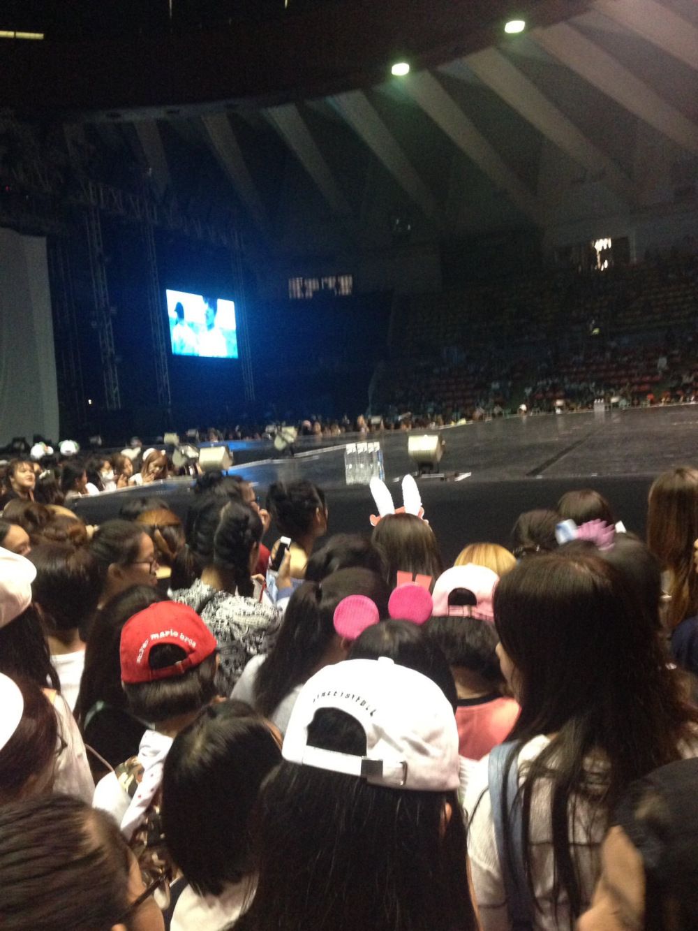 – ต่อไปเราก็ต้องไปเตรียมตัวต่อคิวเข้าคอนค่ะ เราก็เข้าไปนั่งรอ ตอนแรกเราว่าจะไปฝากกระเป๋าก่อนแต่ตอนนั้นจุดรับฝากยังไม่เปิด กว่าจุดรับฝากจะเปิดคิวที่ 1-500 ก็ได้เข้าไปแล้ว แต่เราเอาเป้ไป อยากไปฝาก เลยออกจากแถวไปฝาก พอไปถึงแถวคือเราเห็นความยาวแถวแล้วรู้เลยว่าฝากไม่ทันเข้าคอนแน่ๆ เลยไม่ฝากแล้วกลับมาเข้าแถว (ดูสับสนกับชีวิตเนอะ) มาถึงแถวได้แปปเดียวเขาก็เรียกเข้าเลยค่ะ โชคดีที่ตัดสินใจไม่ฝาก พอผ่านจุดตรวจของแล้วก็รีบวิ่งเข้าไป เราเลือกยืนตรงสเตจเล็กด้านหน้าค่ะ จริงๆคิวที่ 561 ก็ไม่ห่างเวทีเท่าไหร่นะคะ มองเห็นเลยถ้าบังทันมายืน ยืนรอประมาณครึ่งชั่วโมงระหว่างนั้น VTR ก็เปิดเอ็มวี ทุกคนก็ร้องตามค่ะ ตอนนี้บรรยากาศน่ารักมากค่ะ แต่จริงๆแล้วมันคือภาพลวงตา…