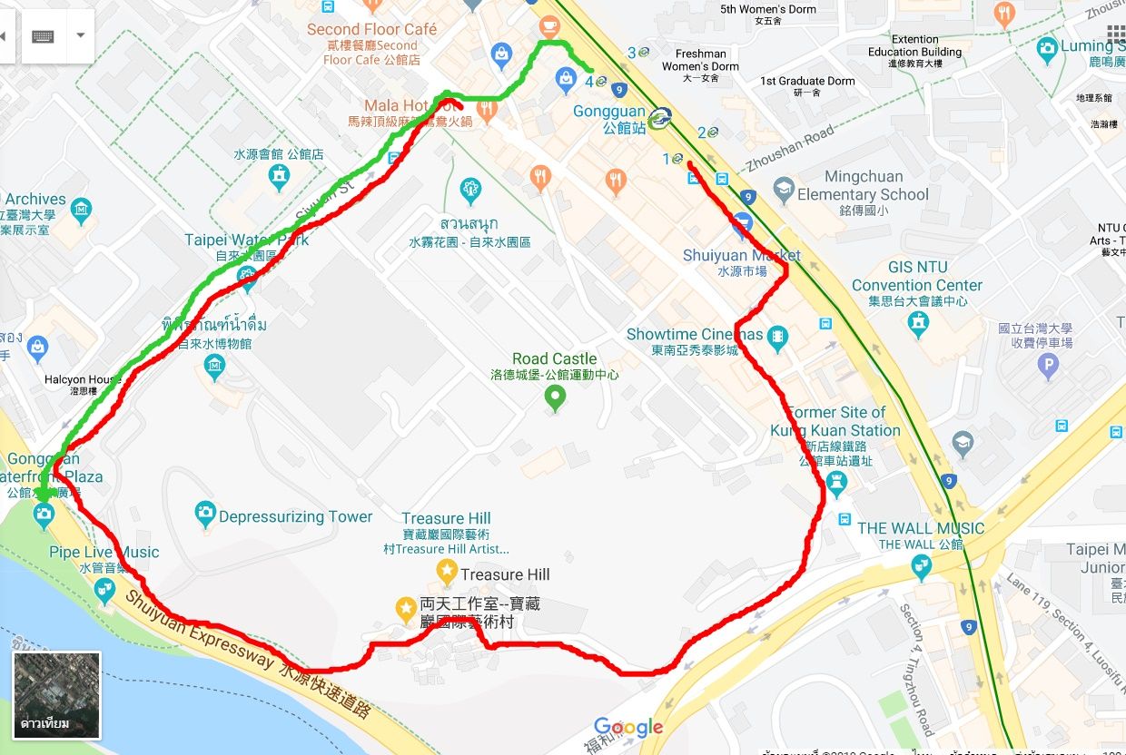 เรานึกสงสัยเรื่องเส้นทางเดินเลยลองกดดูเกิลแมพดู  จากที่เราเดินมามันเหมือนเราเดินย้อนศร  เลยคิดว่าแคปภาพแผนที่แปะลงบล็อกเอาไว้น่าจะดี  เราเดินมาตามเส้นสีแดง  คือเดินออกจาก MRT ประตู 1  แต่ถ้าใครกดเข้ามาอ่านหน้านี้แล้วอยากจะมาปั่นจักรยานที่นี่  เราว่าออกประตู 4 แล้วเดินตามเส้นสีเขียว  จะผ่านพิพิธภัณฑ์น้ำดื่มก่อนจะมาเจอสนามปั่นจักรยานริมแม่น้ำแห่งนี้