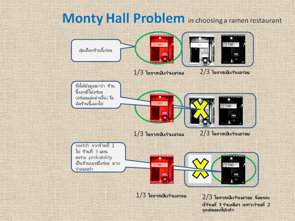 ชายหนุ่มพูดต่อไป “ถ้าเป็นคนส่วนใหญ่ ก็จะบอกว่า chance มัน 50-50 เพราะเหลือให้เลือก 2 ร้าน ดังนั้น เลือกร้านไหนก็เหมือนกัน ซึ่งก็คงลงเอยที่ร้านแรกที่เลือกไว้ แถมเดินใกล้ที่สุดด้วย แต่นี่คุณบอกว่าจะ switch choice ไปอีกร้านเพื่อจะได้มีโอกาสถูกมากขึ้น ก็เลยเดาว่า คุณรู้เรื่อง Monty Hall แน่ๆ ที่ mathematical logic มันสวนทางกับ common sense”