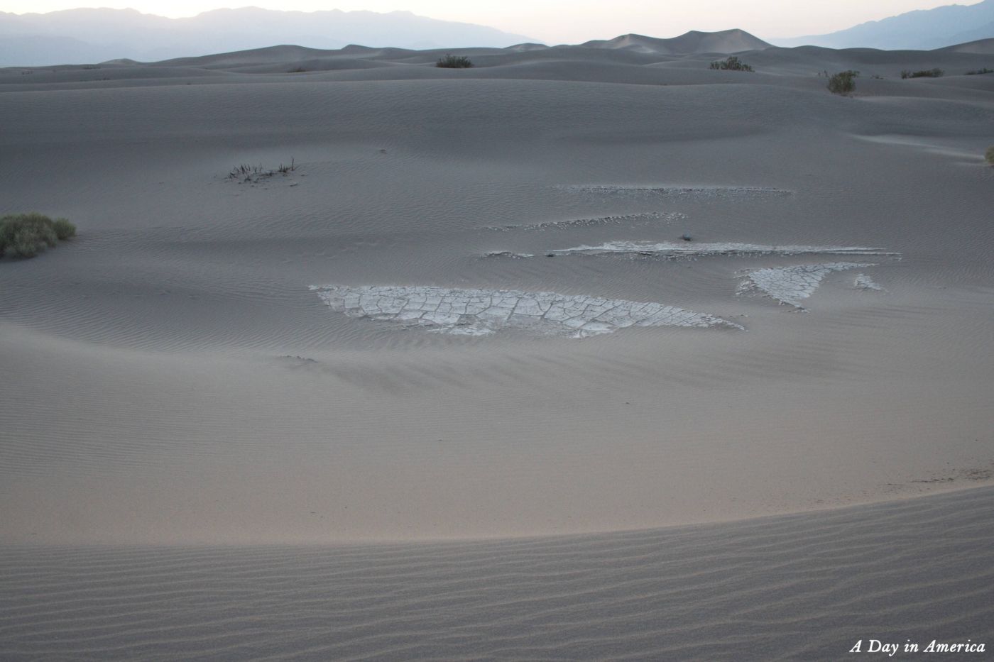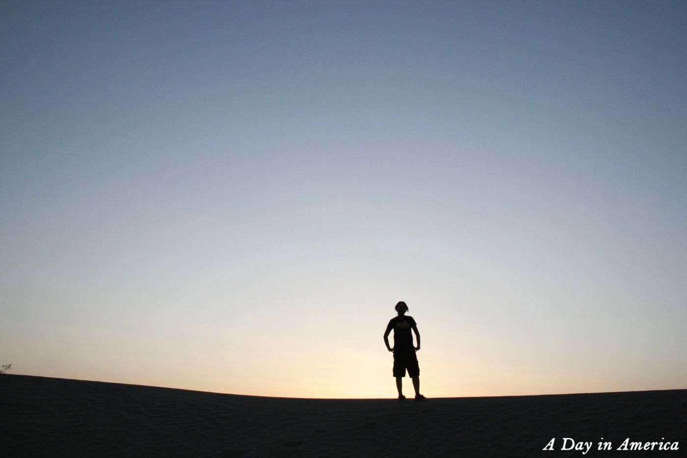 ท้องฟ้าใกล้จะมืดแล้ว พวกเรารีบเดินกลับไปที่รถ พระอาทิตย์คงเกือบตกแล้ว ฉันพยายามรีบบึ่งรถไปที่เนินทราย กระแสลมพัดเอาตะกอนและทรายจากภูเขาและหุบเขามารวมกันไว้ เนินทรายมีหลายแห่งที่นี่ เราเลือกไปที่ Mesquite Flat Dunes อยู่ใจกลางของอุทยานเลยเดินทางไปง่ายที่สุด น้านิดอยากถ่ายรูปทะเลทรายกับแสงอาทิตย์อัสดง พวกเราไปถึงเนินทรายยังพอมีแสงสว่างแบบทไวไลท์อยู่บ้าง ฉันเดินเล่นบนสันทรายไปเรื่อยๆ น้านิดก็ถ่ายรูปเก็บบรรยากาศเรื่อยเปื่อยไป ฉันกลายเป็นนางแบบจำเป็นโดยไม่รู้ แต่ได้รูปเก๋ๆมาหลายรูปทีเดียว ก็ถือว่าคุ้มกะการไล่ล่าแสงสุดท้ายของวัน