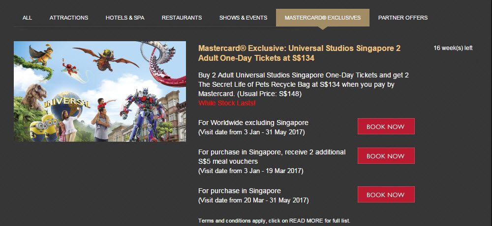 และในครั้งนี้เราก็เจอจริงๆ โปรโมชั่นร่วมกับเครดิต Master Card ค่ะ คือ ถ้าซื้อตั๋วแบบ 1 day pass โดยซื้อ 2 คน จะสงนราคาอยู่ที่ 134 SGD จากปกติถ้าซื้อ 2 คน จะเท่ากับ 152 SGD ซึ่งเมื่อคูณกลับเป็นเงินไทยในราคาโปรโมชั่นนี้ก็ไม่ต่างกับที่ซื้อกับ agent ในไทยมากนักและในครั้งนี้ ยังมีของแถมให้กับคนที่จองโปรโมชั่นนี้ด้วย คือ The Secret Life of Pets Recycle Bag ให้ถึง 2 ใบด้วยกัน ซึ่งของแถมนี้จะไปรับได้ที่ ร้าน Universal Studio Shop ได้เมื่อเดินทางไปถึงค่ะ เมื่อได้พบโปรโมชั่นดีๆ แบบนี้แล้ว เราจะรออะไรล่ะ จองเลย วิธีการจองก็ไม่ยากอะไรมาก เข้าเว็บ เลือกระบุวันที่และจำนวนที่ต้องการ ละจ่ายค่าตั๋วผ่านบัตร Master Card ค่ะ ขอย้ำนะคะว่าต้องจ่ายผ่านบัตร Master Card เท่านั้นถึงจะได้โปรโมชั่นนี้ และเมื่อจองเสร็จเราก็จะได้ e-ticket confirmation + gift vocher สำหรับไว้ไปรับกระเป๋าผ้า ส่งมาที่อีเมล์ของเราที่ได้ให้ไว้ แค่นี้เมื่อได้เราก็พิมพ์ออกมา และนำไปที่หน้าสวนสนุกแล้วก็ยื่นให้เจ้าหน้าที่ได้เลย