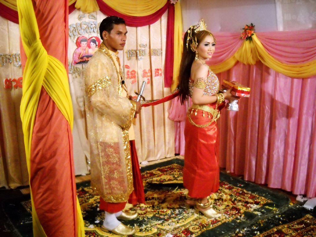 ตำนานเรื่องพระทอง-นางนาค จะสัมพันธ์กับหัวข้อของกลุ่มถัดไปคือ พิธีแต่งงานชาวกัมพูชา ในพิธีแต่งงานของคนกัมพูชาจะมีการเลียนแบบตำนานพระทองนางนาค โดยให้เจ้าบ่าวเดินเกาะสไบเจ้าสาว เจ้าบ่าวรับบทเป็นพระทอง เจ้าสาวรับบทเป็นนางนาค เหตุที่พระทองจับสไบนางนาคเป็นเพราะว่าต้องการจะตามนางนาคไปเมืองบาดาลซึ่งมนุษย์ไปไม่ได้ (เดาว่าหายใจไม่ออกเป็นหลัก) ตามรูปปั้นนี้เลย คู่กับรูปงานแต่งงาน