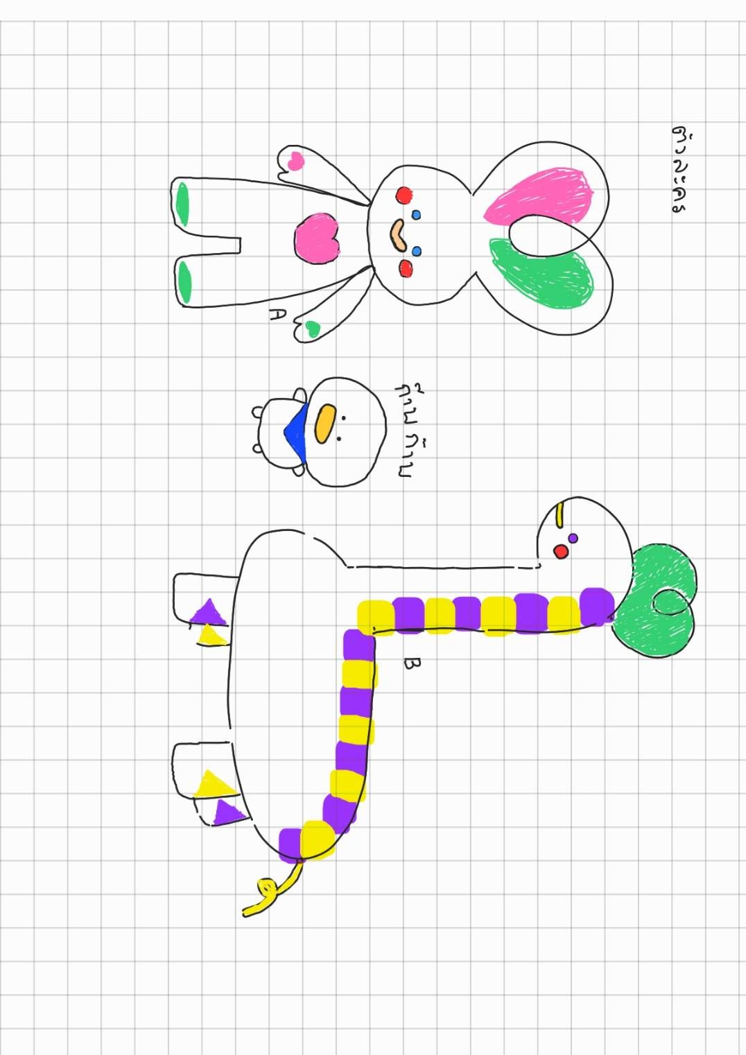 นี่คือร่างตัวละครของเรา จากด้านซ้ายสุดคือตัวละครนำเรื่องนี้ชื่อชั่วคราวคือ A ทางขวาคือตุ๊กตาเป็ดตัวโปรดชื่อว่าก๊าบก๊าบ อ้างอิงมาจากตุ๊กตาเราเอง ส่วนทางขวาคือเพื่อนของ A เลยเรียกว่า B ไปก่อน ส่วนตัวคิดว่าสีของเอกับบีดูโดดเกินไป ก๊าบก๊าบแขนกับขาเล็กมากทำยากกลัวมองไม่เห็น ก็ต้องแก้ต่อไป