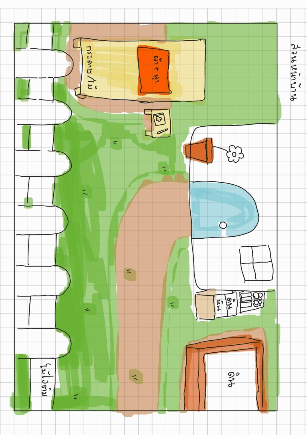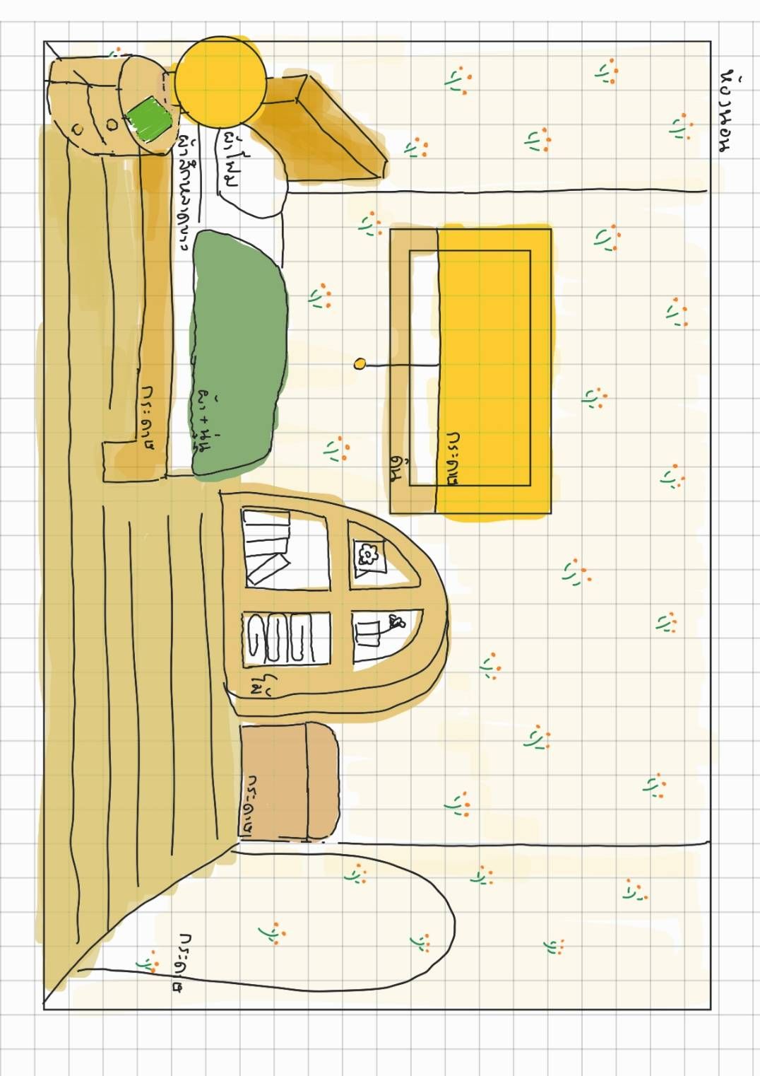 สุดท้ายคือสวนหน้าบ้าน เราออกแบบไว้ว่าพื้นหญ้าหน้าบ้านจะทำจากดินน้ำมัน มีรั้วหน้าบ้านกับเก้าอี้นอนเล่นจากไม้ไอติม มีอุปกรณ์ทำสวน กระบะใส่ดิน ปลูกต้นไม้และอื่นๆ ส่วนดินกับหินก็คิดว่าจะใช้ของจริงไปเลย