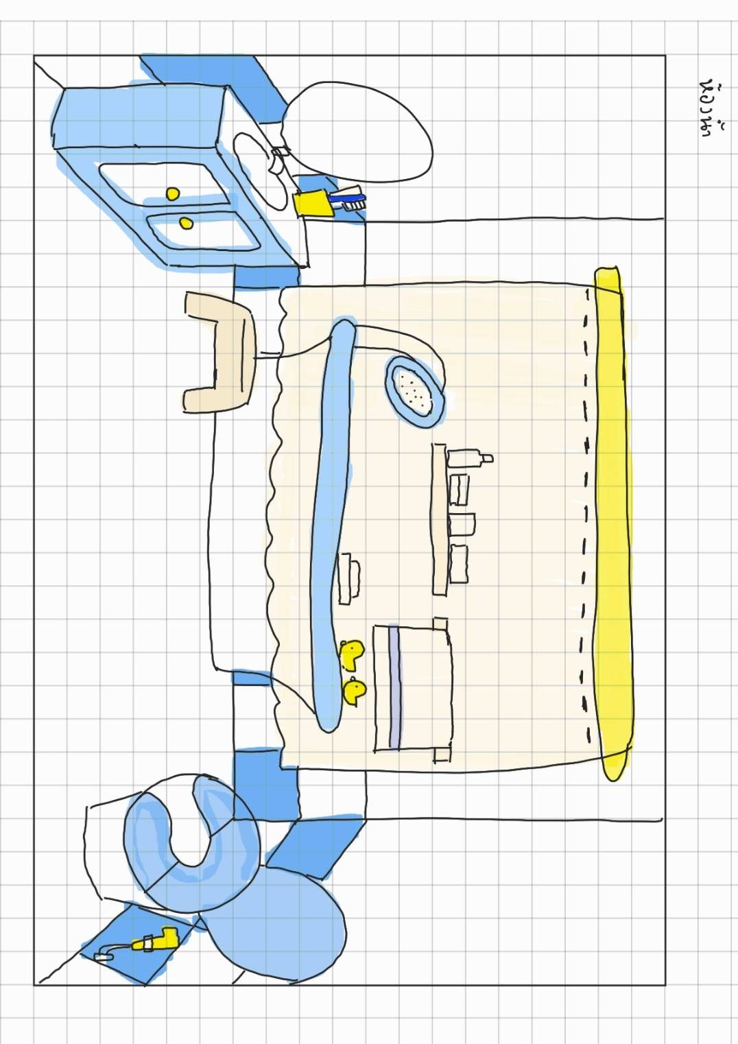 ห้องน้ำ โทนสีขาวเหลืองน้ำเงิน เราวาดให้มีลูกเป็ดอยู่ที่ริมขอบอ่างด้วย