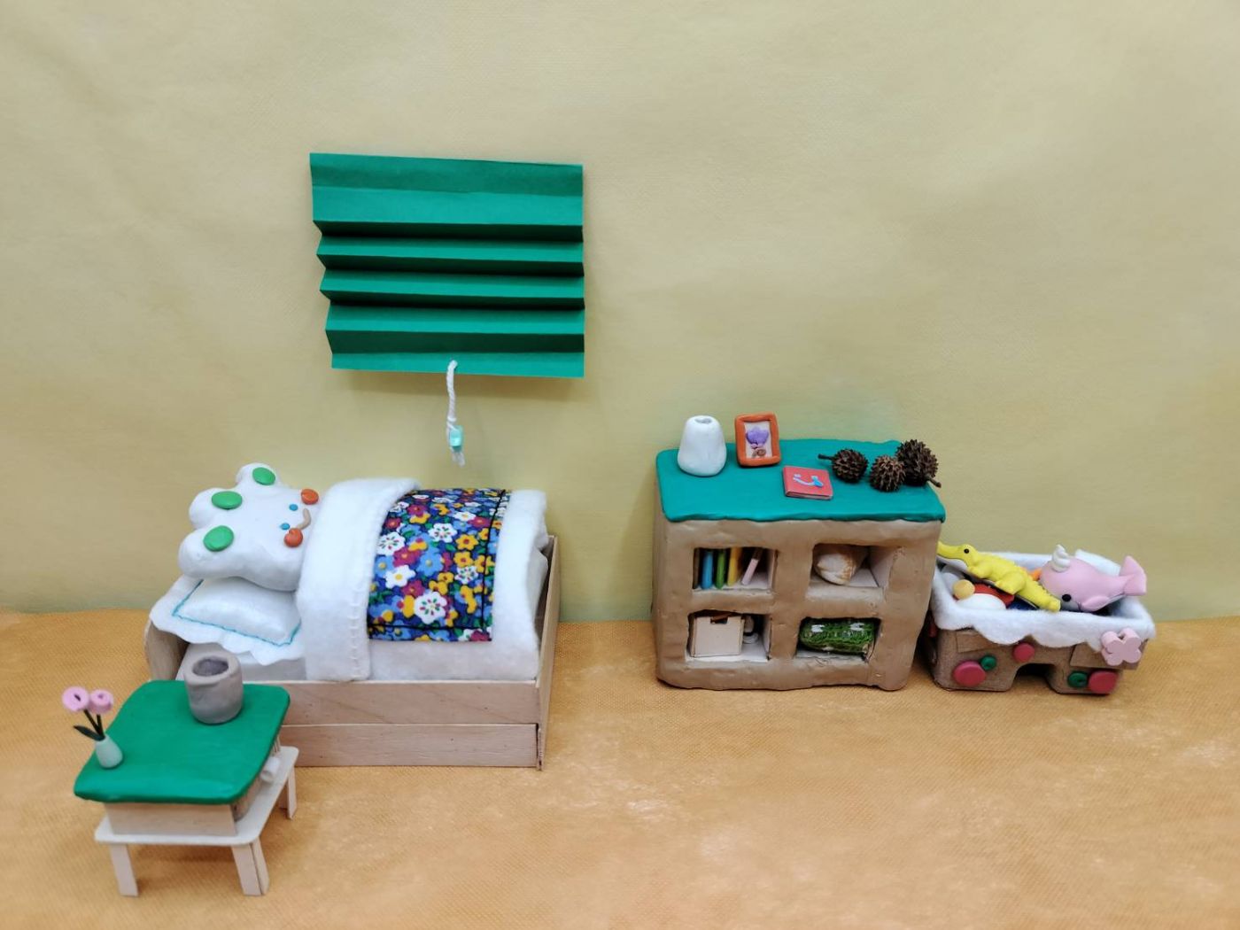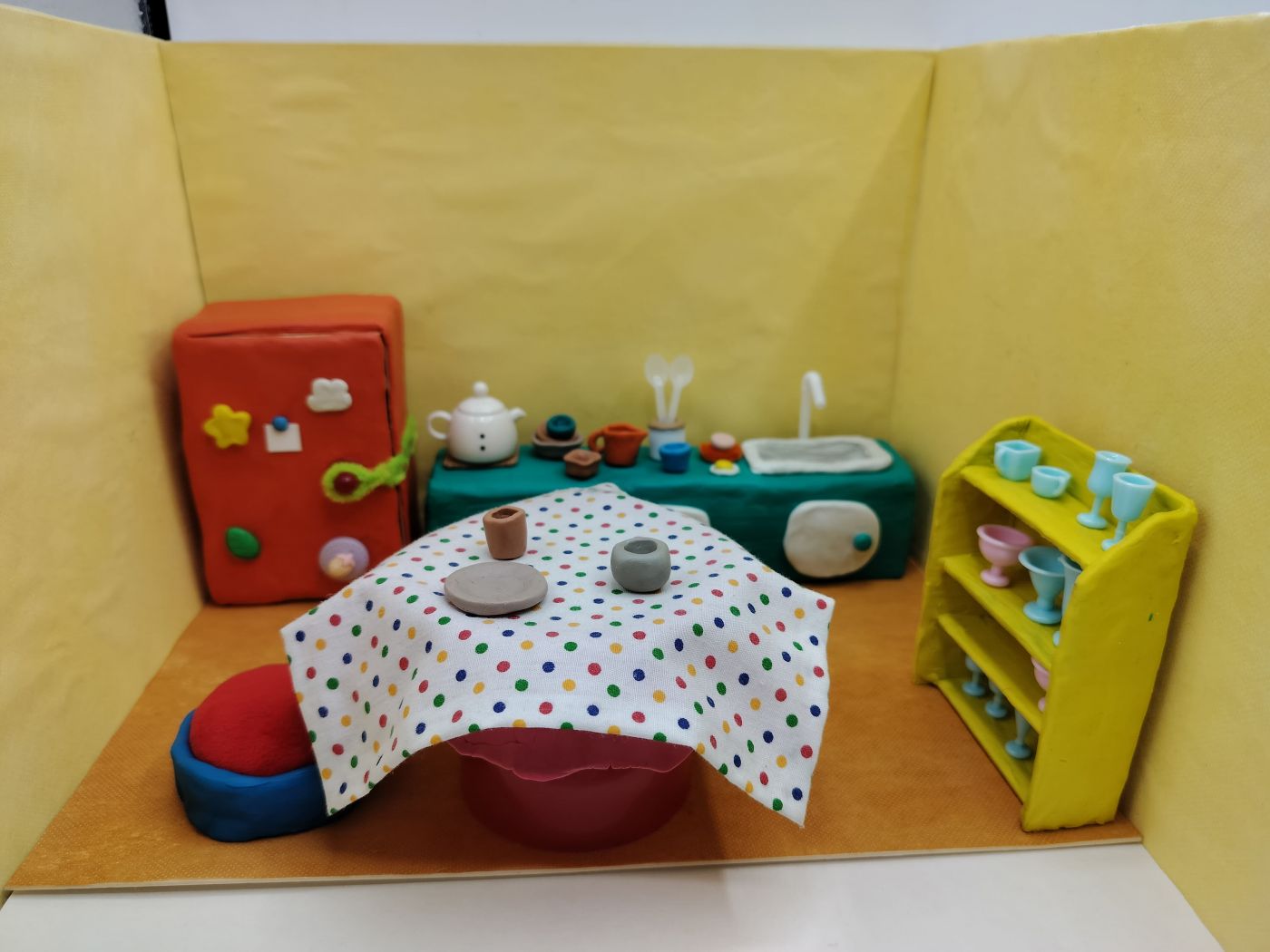หลังจากนั้นเราก็ไม่ยอมทำงาน พอนั่งทำนานๆ สักพักก็จะเริ่มว่อกแว่กไปหาอย่างอื่นทำ งานเราก็คืบหน้าช้ามาก หลังจากเราสังเกตตัวเองแล้วว่ากำลังเหนื่อยก็จะพยายามเติมไฟใหม่ ขุดตัวเองขึ้นมาด้วยการไปนั่งดูแอนิเมชันที่แน่นอนว่าเป็น Stop motion นั่นแหละ เพราะว่าเป็นสิ่งที่ชอบ พอดูแล้วก็จะฮึดขึ้นมาว่าไปทำของตัวเองบ้างดีกว่า เราพยายามทำอย่างอื่นด้วยเช่น จัดตารางเวลาให้ตัวเองมีเวลาทำงาน พักผ่อน ตั้งเป้าหมายงานเล็กๆ ของแต่ละวัน ถ้าทำเสร็จก็ไปพักได้ พยายามนอนให้เร็วขึ้น ตื่นให้เช้าขึ้นเพื่อให้มีเวลามากขึ้นงานจะได้เสร็จเร็ว สุดท้ายแล้วในเดือนมีนาเราก็ทำฉากเกือบทั้งหมดเสร็จ ส่วนที่เหลือไว้ไปทำเดือนเมษาพร้อมๆ กับการจัดฉากตอนลองถ่ายเลย ต่อไปจะเป็นรูปตัวละครและฉากที่เราทำเสร็จแล้ว