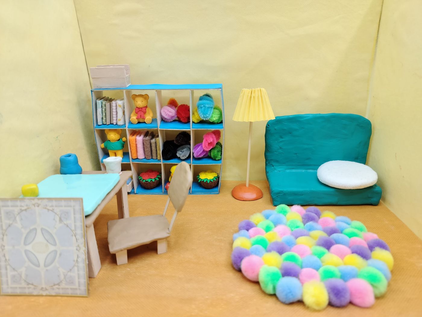 ห้องนั่งเล่น พรมปอมๆ น่ารักนุ่มนิ่มมาก ยังต้องทำของวางบนโต๊ะหนังสือเพิ่มด้วย