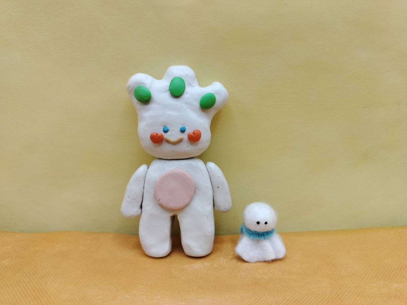 นี่คือตัวละครที่เราออกแบบใหม่และลองปั้นจริงแล้ว เราลองเปลี่ยนจากลักษณะสัตว์สองหูแบบตอนแรกกลายเป็นแบบในรูปแทน ให้ความรู้สึกที่ดูอ่อนโยน เป็นมิตรมากกว่า ไม่น่ารักเกินไปเหมือนแบบแรกที่เป็นกระต่ายหวานๆ ตอนที่นำเสนออาจารย์แนะนำให้ปรับแก้สัดส่วนตุ๊กตาและเพิ่มมิติร่างกายด้วย เพราะตอนนี้มันเป็นหุ่นสี่เหลี่ยมแบนๆ