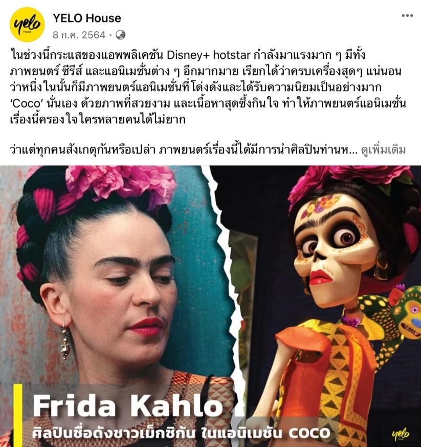 และอีกหนึ่งคอนเทนท์ที่เกี่ยวกับเทรนด์หรือกระแส ตอนนั้นเรากับเพื่อนเห็นว่าแอพพลิเคชันดิสนีย์พลัสฮอตสตาร์กำลังเข้ามาพอดี เราก็คิดกันว่าแล้วมันจะเกี่ยวกับศิลปะได้ยังไงนะ แต่พอคิดไปคิดมามันก็จะมีจุดนึงที่รู้สึกเอ๊ะ และจุดประกายความคิดขึ้นมาได้ นั่นคือเรากับเพื่อนก็ไปนึกแอนิเมชันเรื่องนึงเคยดูกัน คือเรื่อง Coco ที่มีการใส่ศิลปินชื่อดังอย่าง ฟรีดาห์ คาโล ไว้ในเรื่องด้วย เรากับเพื่อนจึงหยิบประเด็นตรงนี้มาทำเป็นคอนเทนท์ประวัติส่วนตัวของศิลปินท่านนี้