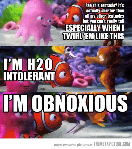 แต่ในวันแรกที่นีโม่ไปโรงเรียนอนุบาลปลาน้อย 555 เพื่อนปลาก็ถามว่าเธอๆ ทำไมครีบเธอแปลกจัง แต่พอมาร์ลินอธิบายปลาน้อยเหล่านี้ก็บอกว่าตัวเองเป็นอะไรเหมือนกัน ไม่ได้เป็นแค่เธอนะ หนวดฉันสั้นไปข้างนึง ฉันแพ้น้ำ (โถ เหมือนที่เราแพ้อากาศตอนนี้เลยเจ้าม้าน้ำ)  นีโม่ไม่ใช่เด็กพิเศษที่จะใช้ชีวิตอยู่ร่วมกับเด็กคนอื่นไม่ได้ แต่ละคนก็มีอะไรพิเศษของตัวเองต่างกันไปและใช้ชีวิตอยู่ได้เหมือนปลาตัวอื่นๆ