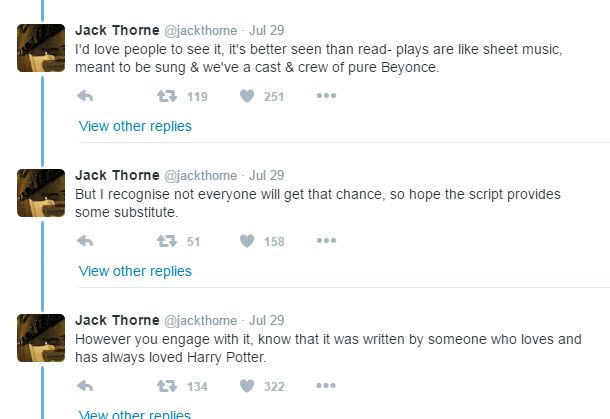 Thorne บอกในทวิตคร่าวๆ ว่า อ่านแล้วไม่ว่าจะรู้สึกยังไง ขอให้รู้ไว้ว่าคนที่เขียนเป็นคนที่รักโลกของแฮร์รี่พอตเตอร์มากๆ เหมือนกัน