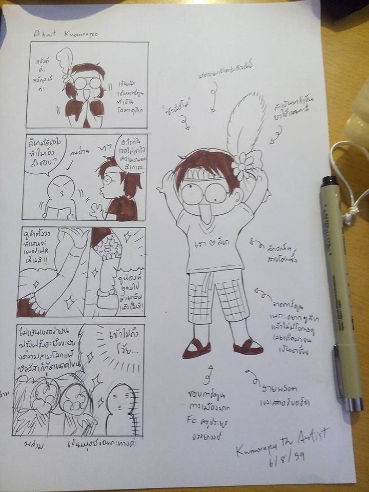 ในเวิร์คช็อปจะมีงานชิ้นนึง งานของวันนี้ให้ทุกคนเขียนมาสค็อตตัวเองกับแก๊ก (ถ้าคิดได้) พี่นักเขียนจะคัดงานมาคนละสองชิ้น และมีรางวัลเล็กน้อยให้ เราก็รู้ดีว่าเรามันไม่ใช่สไตล์เขาอ่ะ 555 คือเราสายพูดมาก เขียนมาก เลยเขียนไปตามปกติ ก็วาดตัวเองกับความโอตาคุลิเกอันเป็นต้นกำเนิดของการมาเขียนเป็นอาชีพ
