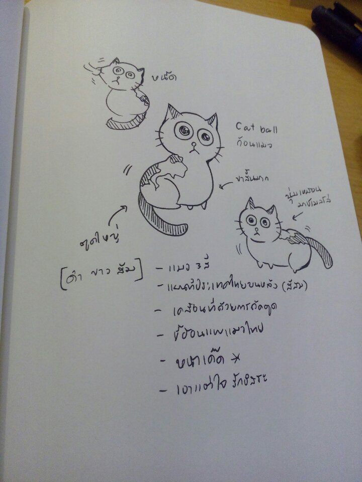 สำหรับโจทย์เวิร์คช็อปคือลองออกแบบคาแรกเตอร์ 10 นาทีแบบมีความท้องถิ่นไทยและสามารถเน้นไปต่อโกอินเตอร์ได้ ปรากฎว่าคาแรกเตอร์โดนใจคือขนมใส่ไส้กับชาวนาไทยค่ะ ส่วนเราออกแบบเป็นไอ้ตัวนี้ไป เอามาจากแมวตัวเอง พออยากให้ใส่ไทยๆ ก็เลยนึกถึงแมวไทยขี้อ้อนกลมๆ และส่วนที่เป็นแมวสามสีคือกูเขียนแผนที่ประเทศไทยแม่งเรยอะไรเงี้ย55555 และคิดว่าอะไรแบบนี้คงมีคนคิดไปแล้วค่ะ