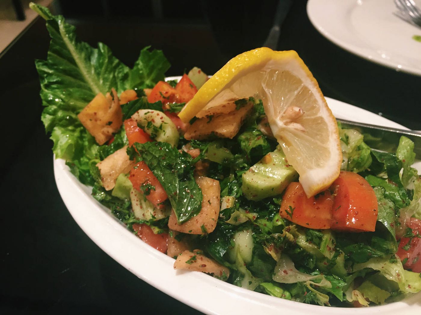 สลัดสไตล์เลบานอน มีเอกลักษณ์พิเศษคือ ใส่ sumac พืชตระกูลเบอร์รี่ ที่ส่งตรงมาจากเลบานอน มีรสเปรี้ยว นำมาปั่นคลุกกับผักสดนานาชนิด ที่เห็นเป็นจุดสีแดงๆนั่นแหละ (โทรไปถามพี่พนักงานว่ามันคืออะไร พี่เค้าบอก "ใส๊ สะแหมะด้วยค่า เป็น ผลลาม้ายมาจากเลบานอนค่า" บทความนี้เขียนนานสุดตรงหาสะแหมะของพี่นี่แหละค่า -,-") ราดด้วยน้ำสลัดที่มีส่วนผสมของ มิ้นท์ เลมอน เกลือและน้ำมันมะกอก เพิ่มความกรุบกรอบด้วยแป้ง พิต้าอบ ชิ้นเล็กๆ จานนี้รสหนักไปทางเปรี้ยว กินคำแรกทำเอาตาหยี แนะนำว่าให้ทาน.... ครั้งเดียวพอ เห้ย ไม่ใช่ ทานคู่กับขนมปังจะเข้ากันมากกว่า