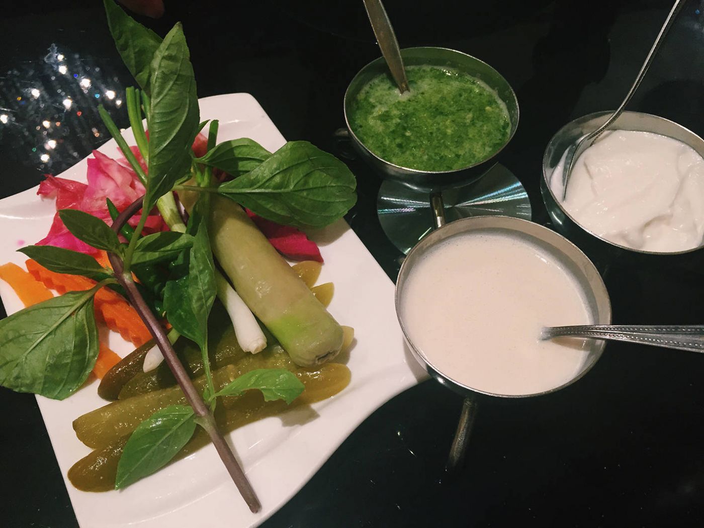 เรียกน้ำย่อยกันด้วย ผักดองนานาชนิด เสิร์ฟพร้อมซอส 3 แบบ Garlic Mousse ครีมกระเทียม Tahini Sauce ซอสครีมเปรี้ยว นุ่มๆ คล้ายโยเกิร์ต (อันนี้เด็ด) และ Spicy Sauce คล้ายน้ำจิ้มซีฟู๊ด (ใครไม่ใช่สายแซ่บ ระวังลิ้นด้วะ)