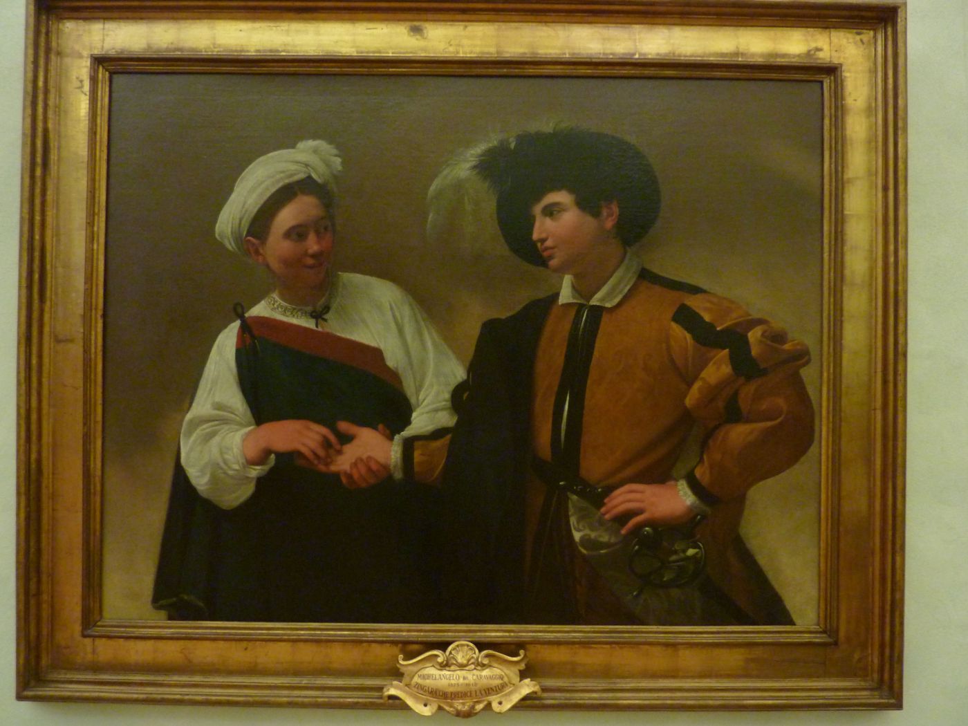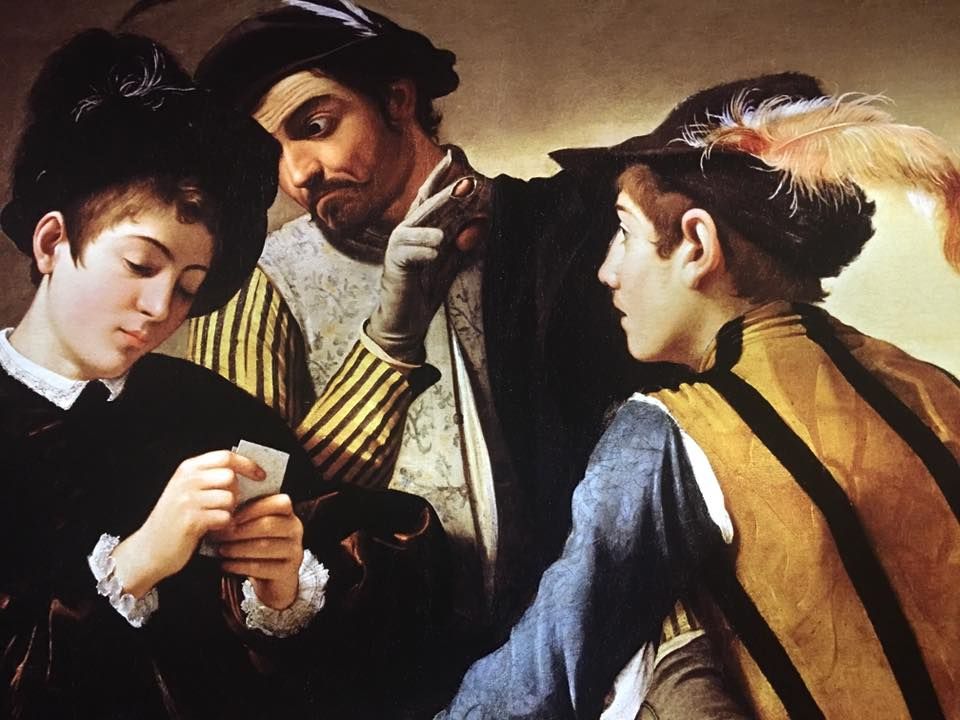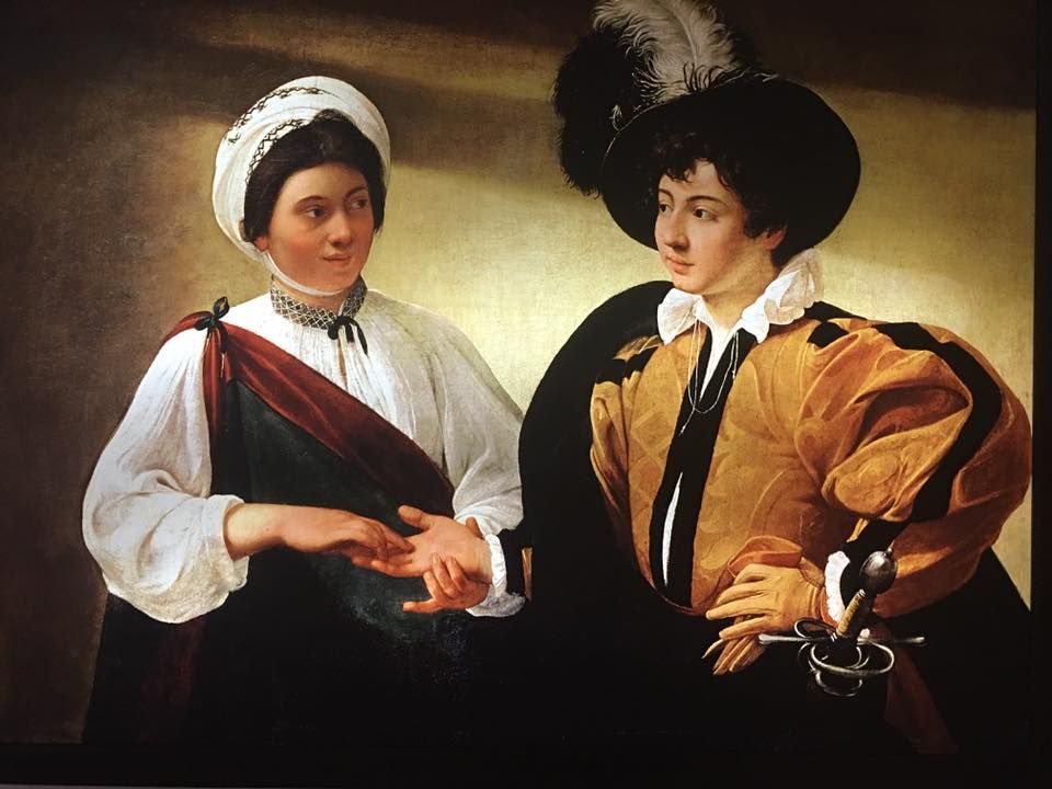แต่ถ้าถามเราว่าเราชอบผลงานแนวไหนของคาราวัจโจ ถ้านอกจากภาพความรักชนะทุกสิ่ง เราชอบผลงานจากประสบการณ์ข้างถนนของเขา เราว่าตลกดี เช่นภาพนักดูดวงที่กำลังจะขโมยแหวนของชายหนุ่มชนชั้นสูง ที่เดินทางจากต่างจังหวัดมายังกรุงโรม ระหว่างที่หมอดูกำลังเล่าถึงดวงชะตาของชายหนุ่ม มือของเธอก็ค่อยๆดึงแหวนออกมาจากนิ้ว ที่จริงมีภาพนี้มีสองแบบอย่างภาพที่เราถ่ายมาจะเป็นภาพที่ปัจจุบันอยู่ที่พิพิธภัณฑ์ลูฟวร์ เบื้องหลังการมายังกรุงปารีสของภาพก็คือในปี ค.ศ. 1665 จาน ลอเรนโซ แบร์นินี ได้นำเสนอภาพวาดนี้ ณ ราชสำนักของพระเจ้าหลุยส์ที่ 14 ส่วนภาพที่สอง ปัจจุบันนี้อยู่ที่พิพิธภัณฑ์ภาพวาดโรมคาปิโตลิเน เป็นของพระคาร์ดินัลเดล มอนเต กระทั่งทายาทของพระคาร์ดินัลขายให้พระคาร์ดินัลปิโอ และผลงานชิ้นนี้เองทำให้คาราวัจโจกลายเป็นที่รู้จัก ในฐานะจิตรกรที่น่าสนใจแห่งโรม และเริ่มมีความคิดที่จะออกจากสตูดิโอ