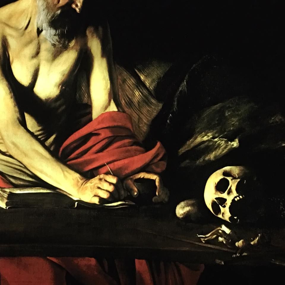 ภาพนี้อยู่ที่หอสวดมนต์แห่งอาสนวิหารเซนต์จอห์น เมืองวัลเลตตา ประเทศมอลต้า เช่นเดียวกับภาพการตัดศีรษะนักบุญจอห์นผู้ให้บัพติศมา ทางขวาของภาพนักบุญเจอโรมเขียนหนังสือจะมีสัญลักษณ์ทางทหารซึ่งเชื่อว่าเป็นของอิพโพลิโต มาลาสปินา ผู้นำของลัทธิอัศวินแห่งเซนต์จอห์น (อัศวินแห่งมอลตา)
