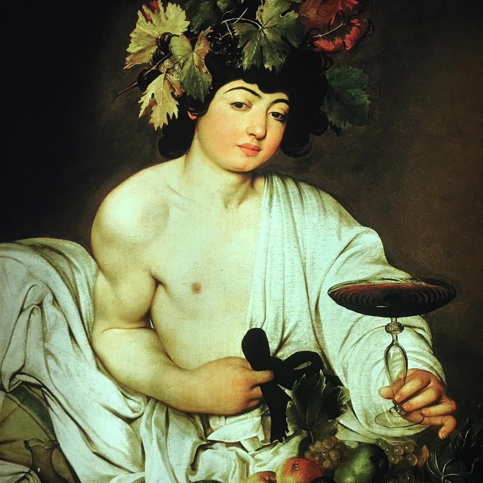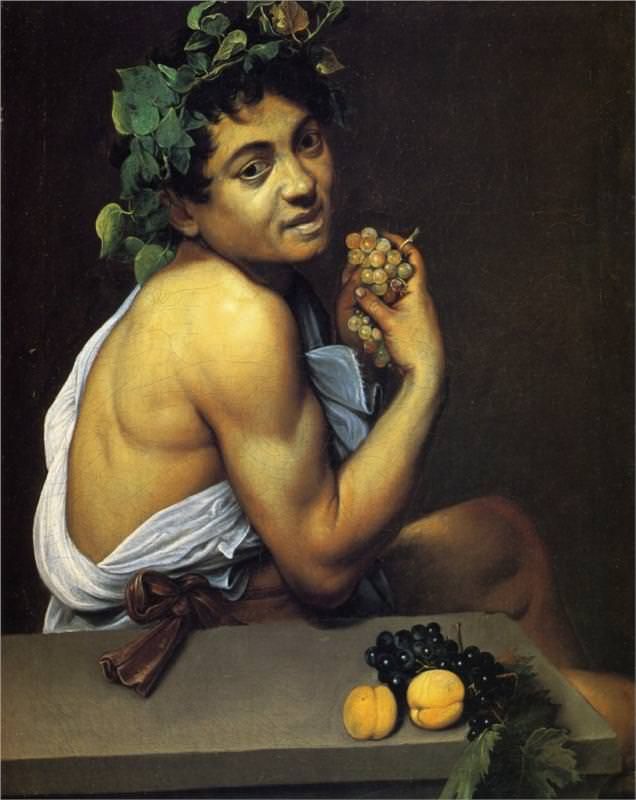 ต่อมาเราก็มาดูภาพนี้ ตามคำบรรยายเขียนไว้ว่าคาราวัจโจอาจพบชายหนุ่มผู้นี้อยู่ข้างถนนและใช้เขาเป็นแบบสำหรับเทพแห่งไวน์ บัคคัสในภาพแต่งตัวแบบชาวโรมันโบราณ สวมมงกุฎดอกไม้ที่ประดับไปด้วยองุ่นและใบไม้ ในมือถือแก้วไวน์ที่สวยงามที่มีไวน์แดงอยู่เต็มแก้ว ภาพนี้จะมีความคลาสสิค แต่ในบางรายละเอียดก็ยังคงมีความเป็นธรรมชาติ ความสมจริงของผลไม้ โดยเฉพาะเล็บที่สกปรกของบัคคัส ซึ่งรายละเอียดเหล่านี้ไม่เหมาะสมกับภาพลักษณ์ของเทพอย่างแน่นอน