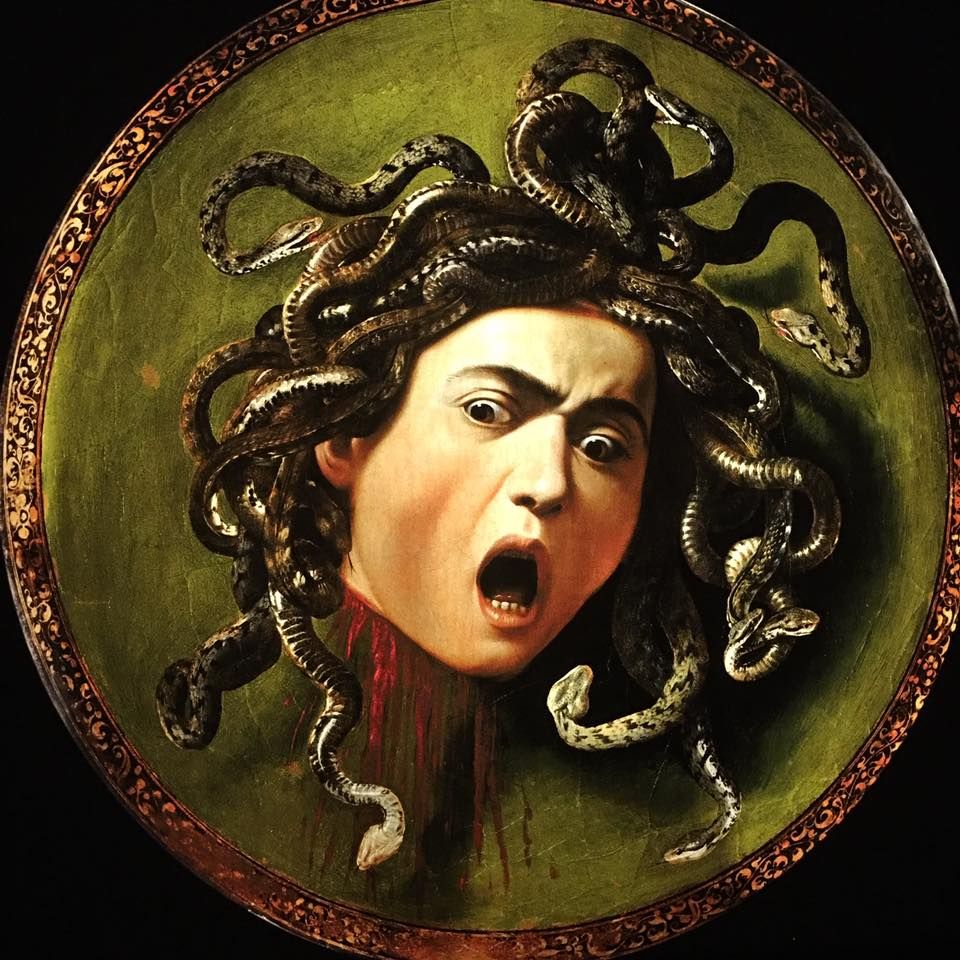 ใส่มาเฉยๆให้ดูไม่มีตัวหนังสือหนาแน่น //โล่เมดูซ่าภาพนี้เราถ่ายมาเอง ของจริงจัดแสดงอยูที่หอศิลป์อุฟิซี เมืองฟลอเรนซ์ คาราวัจโจได้วาดลงบนโล่ทรงกลมตกแต่งด้วยขอบทอง ตามคำสั่งของพระคาร์ดินัล Francesco Maria Del Monte เป็นของขวัญให้ Ferdinando de’Medici โดยตัวของคาราวัจโจเองต้องการที่จะแข่งกับศิลปินคนอื่นๆ ด้วยการวาดภาพเมดูซ่ามีความแตกต่างออกไป เป็นภาพเมดูซ่าตาเบิกโพลงที่ถูกเพอร์ซิอุสฆ่าให้ดูสมจริงเหมือนคนที่ถูกตัดคอจริงๆ เพราะเขามักจะเข้าร่วมดูการประหารในที่สาธาณะที่ Campo de’Fiori ทำให้เขาได้เห็นคนที่ถูกประหารนั้นตอนตายตาไม่ได้ปิด นี่คือสาเหตุที่ต้องปิดตาคนที่ถูกประหาร และคาราวัจโจก็ไม่ปิดตาให้กับเมดูซ่าภาพนี้