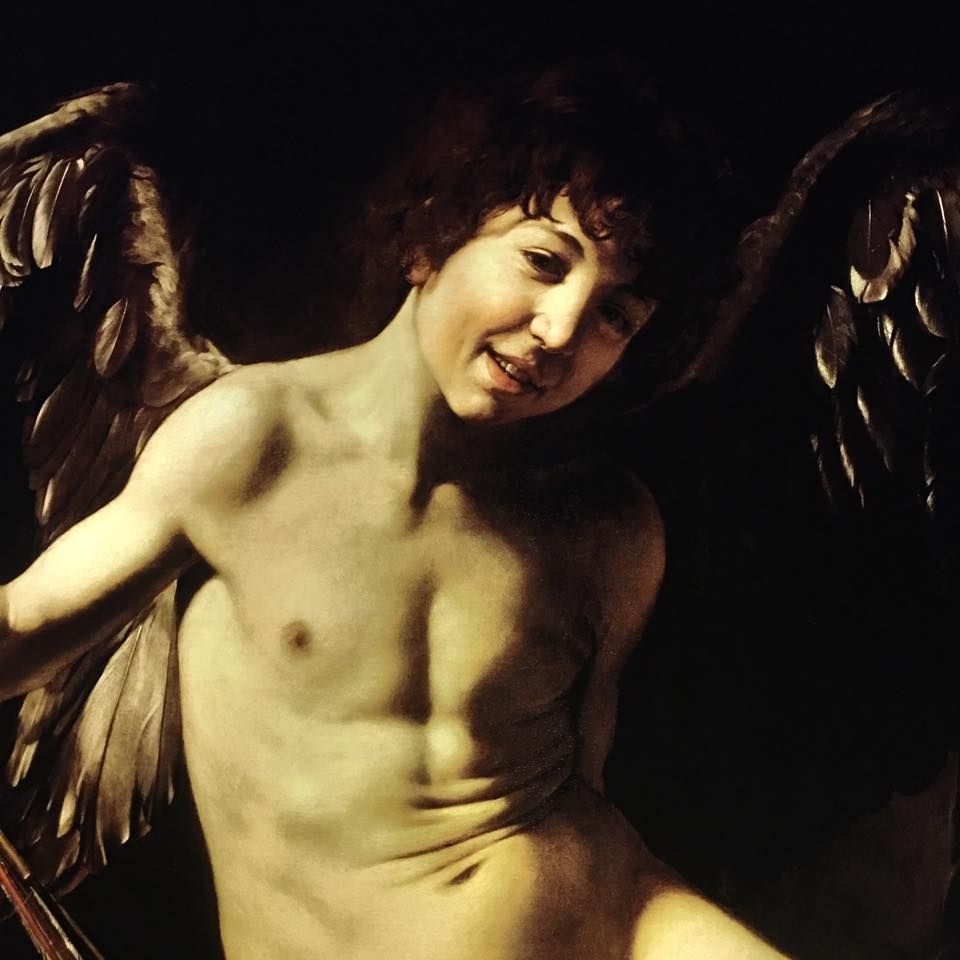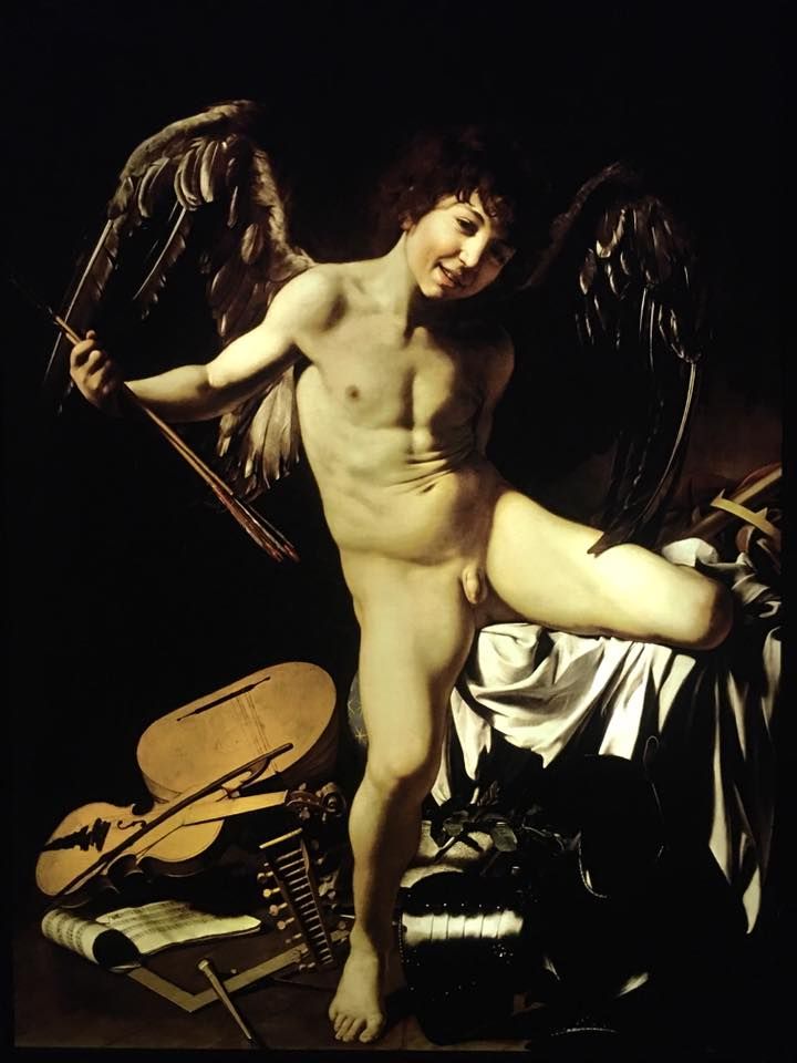 มาพูดถึงงานที่เราชอบมากๆดีกว่าเราชอบภาพความรักชนะทุกสิ่ง หรือ Amor Victorious (Amore vincitore -Omnia vincit amor) ภาพนี้เป็นภาพที่คาราวัจโจวาดขึ้นมาเองโดยไม่ได้มีใครว่าจ้าง เขาสามารถใส่ความคิดมุมมองของเขาลงไปได้เต็มที่ เด็กชายในภาพก็คือ Cecco ซึ่งเป็นลูกศิษย์ของเขาเอง ภาพนี้เป็นภาพคิวปิดยืนเปลือย ยืนเหนือศิลปะวิทยาการต่างๆ ซึ่งศิลปะวิทยาการในงานของคาราวัจโจคือเครื่องดนตรี โน้ตเพลง และงานชิ้นนี้แสดงสัญลักษณ์ทางเพศทั้งชายและหญิง(ที่รอยยับของผ้า)