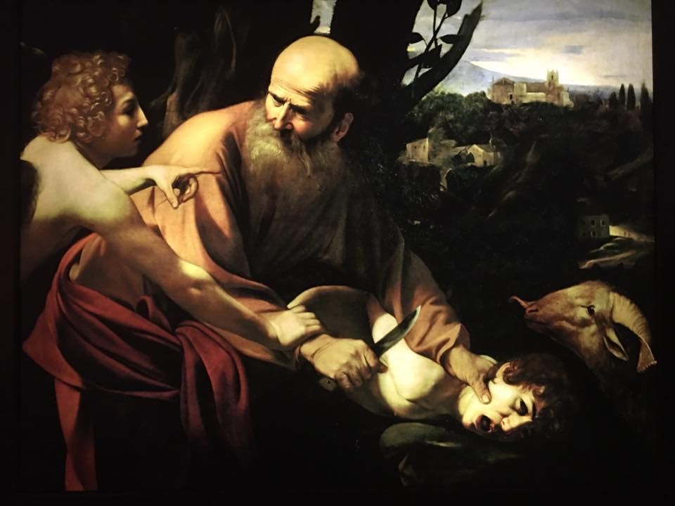 จากที่เราเล่าไปด้านบนเมื่อคาราวัจโจมีชื่อเสียงมาก เขาก็เริ่มวาดภาพที่เกี่ยวข้องกับศาสนามากขึ้น อย่างภาพนี้มีอยู่ในพระคัมภีร์พันธสัญญาเดิม(ปฐมกาล) เป็นบททดสอบความเชื่อของอับราฮัมต่อพระเจ้า(พระยะโฮวา) โดยให้อับราฮัมนำลูกชายคนโตไปถวายเป็นเครื่องบูชาแด่พระองค์แทนแกะ แต่สุดท้ายทูตสวรรค์ก็มาแจ้งแก่อับราฮัมว่าให้หยุดเสีย เพราะพระองค์รับรู้แล้วว่าเขาเชื่อในพระองค์ นอกจากเนื้อหาว่าด้วยศาสนาในภาพ ภาพนี้ยังมีจุดเด่นตรงมีพื้นหลังที่มีรายละเอียดแตกต่างจากภาพอื่นๆของเขาอีกด้วย