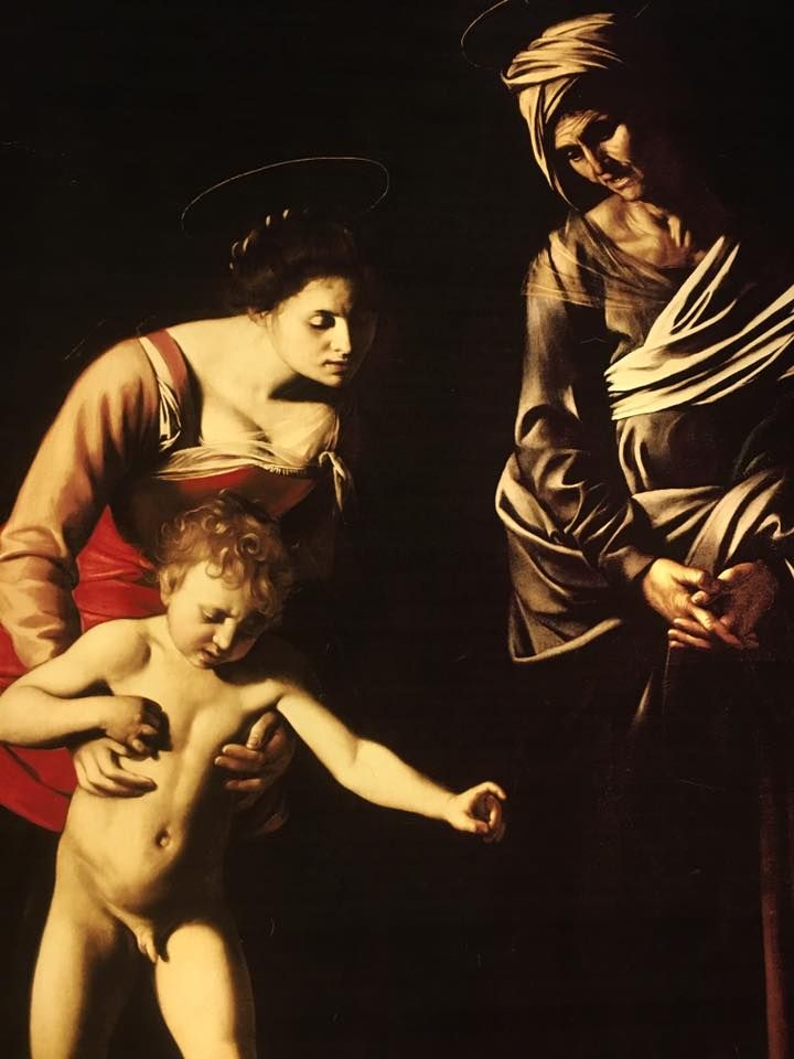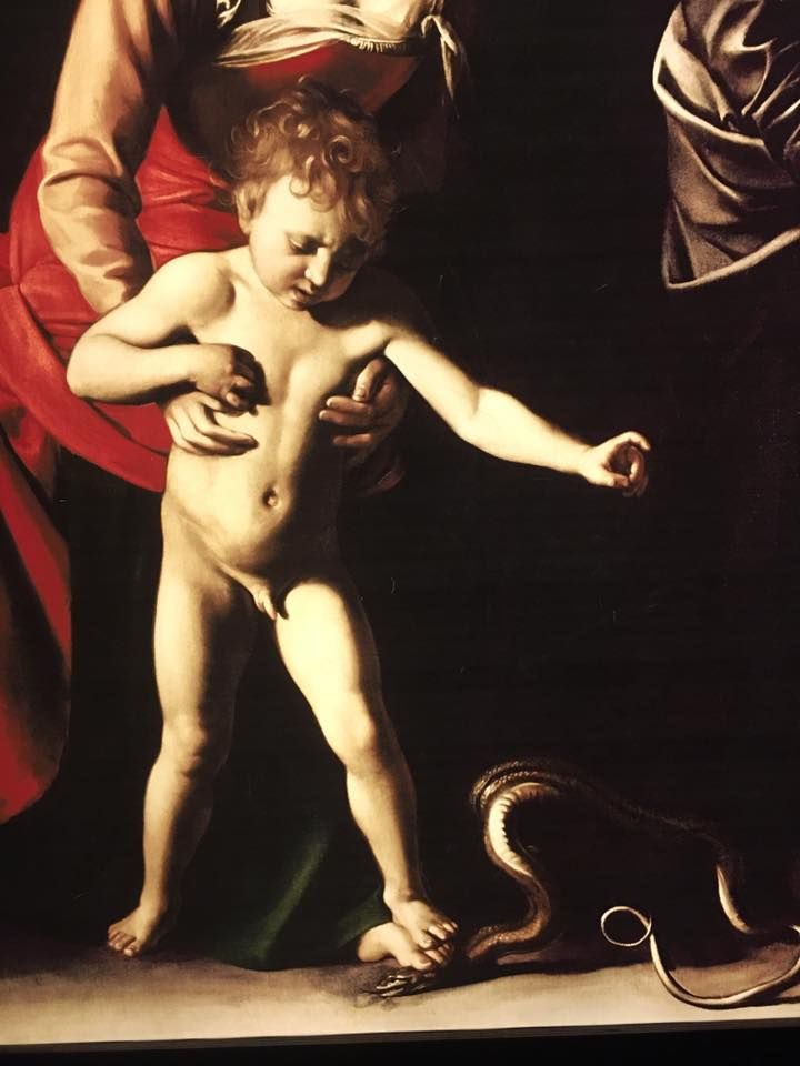 ภาพนี้ก็เช่นกัน ทั้งพระบุตรและพระเเม่มารีไม่ต่างกับคนธรรมดาเลย โดยภาพนี้จริงๆแล้วจะต้องนำไปติดตั้งที่แท่นบูชาของที่โบสถ์น้อยปาลาเฟรนิเอรี ในมหาวิหารเซนต์ปีเตอร์ในกรุงโรม แขวนได้เพียง 2 วันก็ต้องเอาลง เพราะพระคาร์ดินัลรับไม่ได้ ซึ่งนักประวัติศาสตร์ศิลปะด้านผลงานคาราวัจโจในยุคร่วมสมัย เชื่อว่าเหตุผลที่นักบวชเหล่านั้นปฏิเสธภาพวาดนี้ เพราะว่ามีการ “ลดทอนความศักดิ์สิทธิ์” คือ พระกุมารในภาพเปลือยให้เห็นอวัยวะสืบพันธุ์อย่างชัดเจนคล้ายกับภาพ ความรักชนะทุกสิ่ง การมีงูเลื้อยอยู่บนพื้น และทรวงอกของพระแม่มารีย์ที่เอ่อล้นออกมายามค้อมตัวมาประคองบุตรชายนั้นอาจไม่เหมาะสมกับสถานที่ และขัดกับตำแหน่งที่ภาพจะไปประดับ ซึ่งสำหรับคาราวัจโจเองภาพแม่เลี้ยงลูกแบบนี้ก็พบเห็นได้ทั่วไป แต่เมื่อเขายิ่งถูกปฏิเสธงานคาราวัจโจก็ยิ่งมีชื่อเสียง คนก็จะยิ่งอยากเข้าไปดู