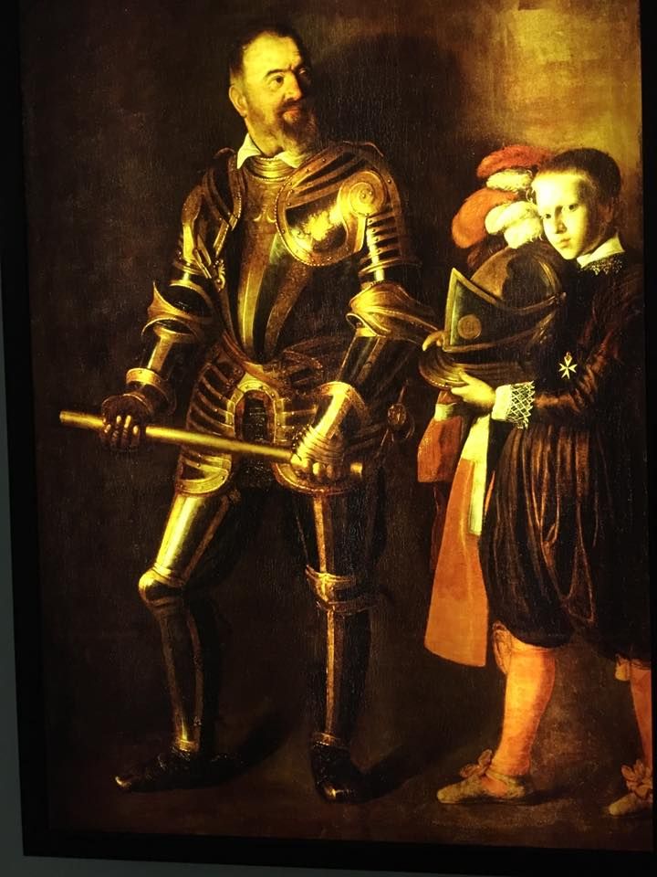 ขณะสวมชุดนักรบเหล็กสีทองโลหะจากยุคศตวรรษที่16 ในมือของวิกญาคอร์ทถือสัญลักษณ์ของผู้บัญชาการแห่งกองทัพบกและกองทัพเรือมอลต้า และเด็กรับใช้ทางขวาถือหมวกเกราะ
