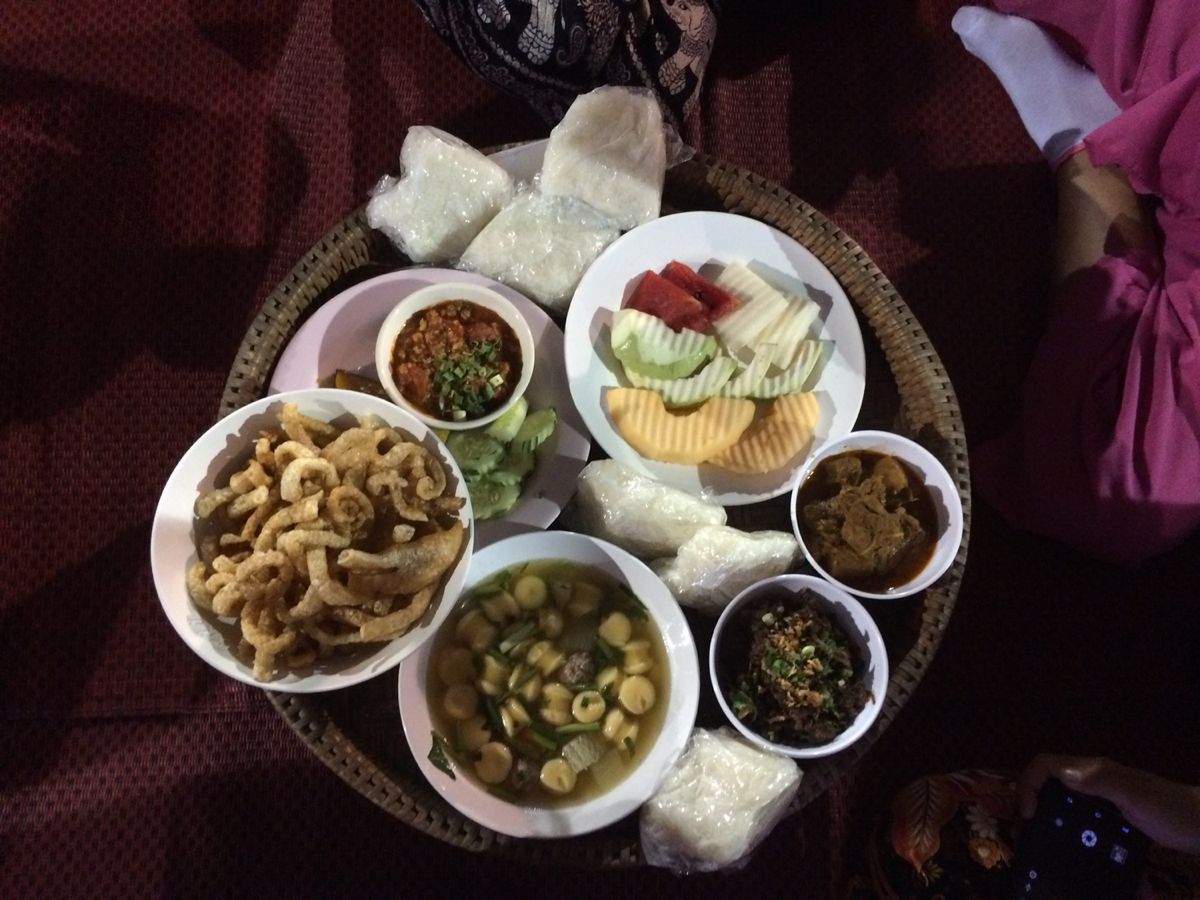อย่างที่บอกไปว่าวันนี้มื้อเย็นของเราคือขันโตก ซึ่งประกอบไปด้วย ข้าวเหนียว แกงโฮะ ต้มจืด แคปหมู น้ำพริกและผลไม้ สารภาพเลยตอนแรกคิดว่าแกงโฮะคือมัสมั่น อร่อยมากยิ่งได้นั่งกินกะเพื่อนนิ่งอร่อยเลย แล้วก็มีพิธีรับขวัญดูขลังมากๆส่วนช่วงการแสดงเราก็ชิวๆนอนดูสบาย~