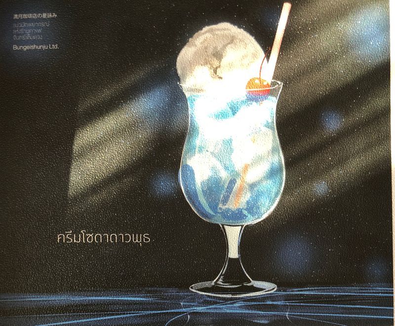 อยากบอกว่าโปสการ์ดที่แถมมากับหนังสือนั้นภาพสวยและน่ากินมาก เห็นแล้วก็อยากจะหลงเดินไปเจอ ร้านกาแฟจันทร์เต็มดวง ที่มีมาสเตอร์แมวและผู้ช่วยที่มีชื่อเป็นดวงดาว เสิร์ฟเมนูของหวานและเครื่องดื่มที่ไม่มีในเมนู