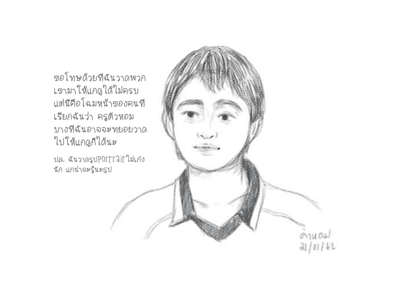 สวัสดีครูตัวหอม ฉันล่ะชอบชื่อนี้ที่หลงตั้งให้แกจริงๆนะหอม แกตัวหอมจริงๆอย่างที่เด็กๆบอก ฉันคนนึงละที่เห็นด้วย ออกตัวก่อนเลยนะว่าฉันไม่ใช่โรคจิต เวลานั่งเรียนข้างแกก็ได้กลิ่นหอมแล้ว ฉันไม่รู้จะอธิบายความหอมของแกยังไงดี หอมที่เป็นคำหอมน่ะ คงเข้าใจที่ฉันบอกใช่มั้ย แต่แม่แกก็ช่างตั้งชื่อนะ หอมสมชื่อจริงๆ