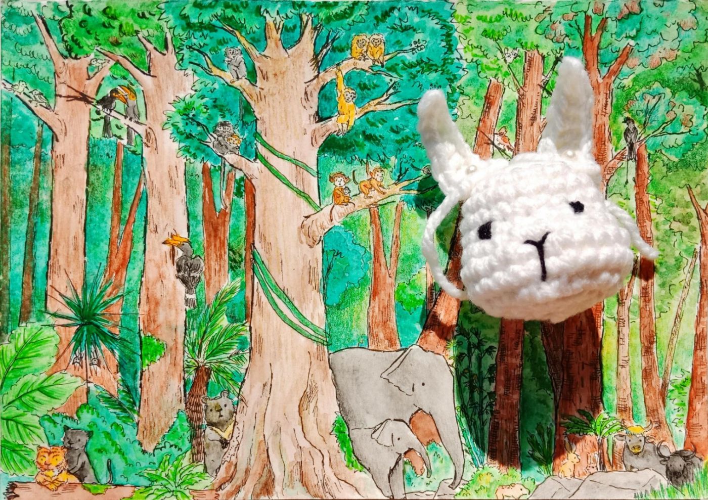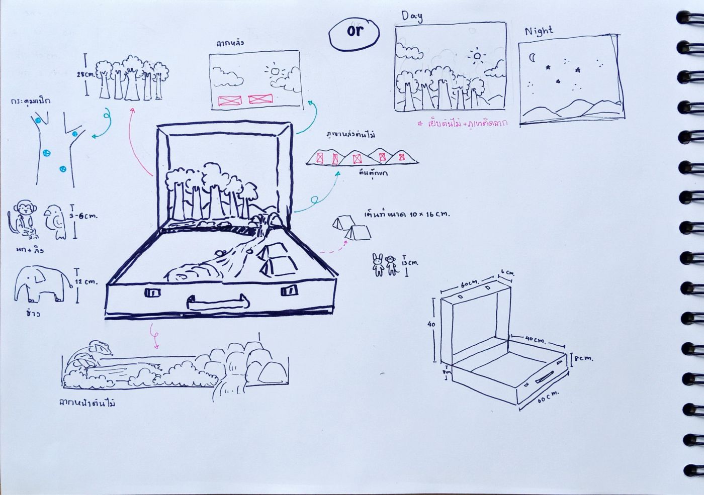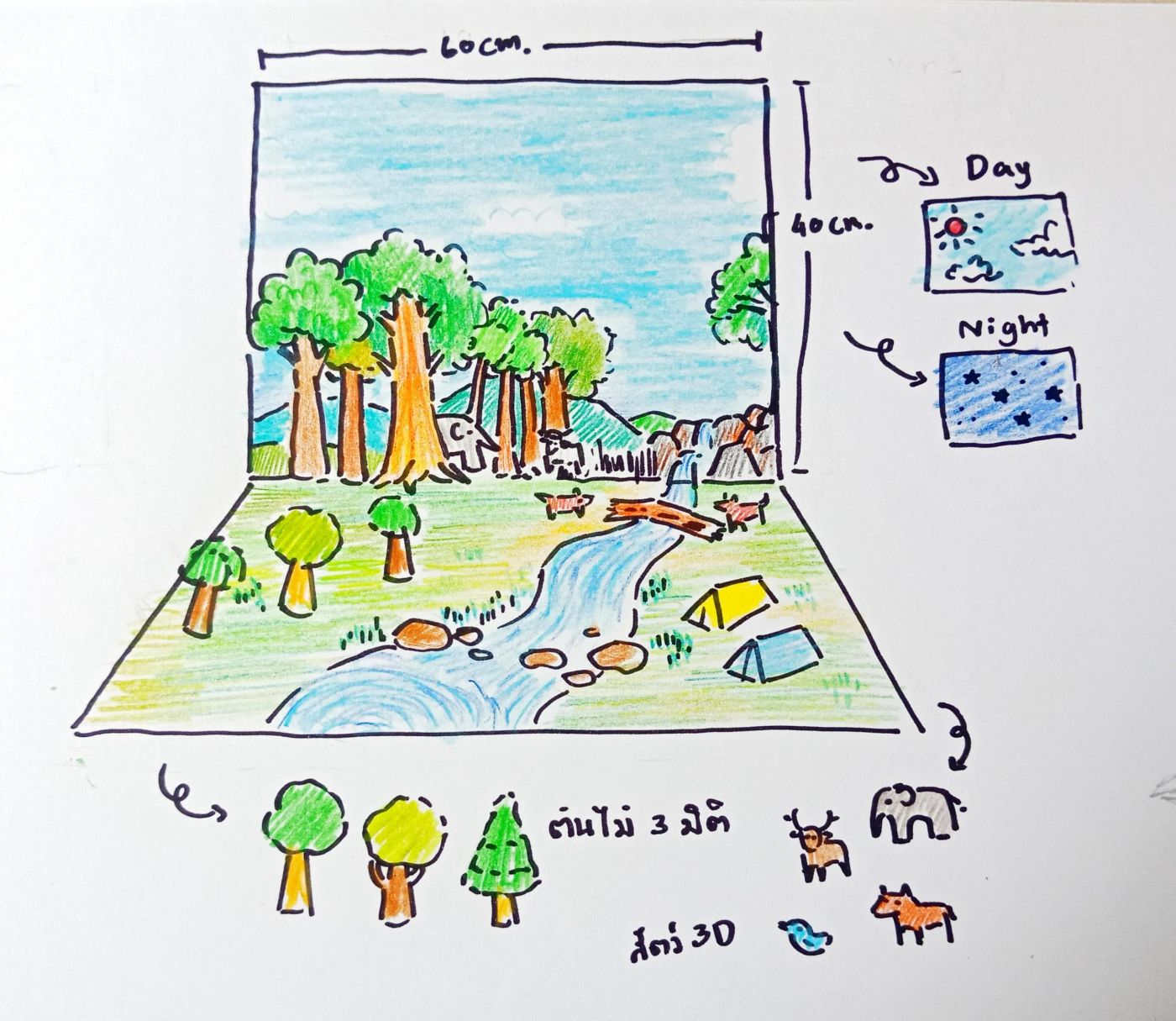 พอเย็บผ้าสักหลาดแล้วสนุกดี ก็เลยคิดเล่น ๆ ว่างั้นทำวานให้เป็นผ้าสักหลาดทั้งหมดเลยดีไหม แล้วเราก็ลองวาดแบบออกมา เป็นฉากผ้าสักหลาดที่รวมเอาฉากป่า ลานกางเต็นท์ ลำธาร และฉากดูดาวมาไว้ด้วยกันใน 1 ฉาก แล้วในฉากก็มีตุ๊กตาถัก เต็นท์ และถุงนอนให้เราเล่นสมมติเป็นนักผจญภัยในป่า มีต้นไม้และสัตว์ที่เราสามารถเลือกได้ว่าจะวางตรงไหน และก็มีฉากกลางวันกลางคืนที่สลับกันได้ด้วย