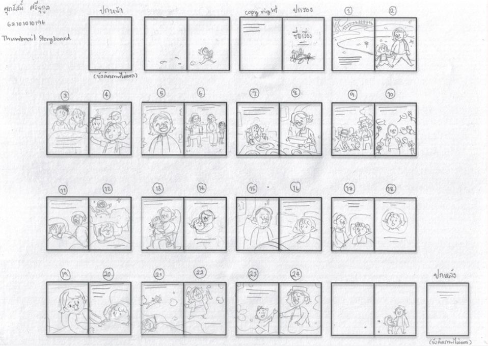 โอเค กลับมาที่เนื้อหาและการดำเนินงาน 30% หลังจากได้พล็อตแล้วเรียบร้อย ฉันก็ดำเนินการปรับแก้เนื้อหามาโดยตลอดพร้อมกับวาด Thumbnail Storyboard และออกแบบตัวละครควบคู่ไปด้วย เริ่มแรกฉันวางเนื้อหาและภาพเอาไว้ที่ 24 หน้า แต่หลังจากหารือกับอาจารย์ที่ปรึกษาแล้วจึงตัดสินใจเพิ่มเป็น 32-36 หน้า เพื่อให้สามารถใส่รายละเอียดเพิ่มเติมได้และเสริมให้เนื้อเรื่องกลมกล่อม สมบูรณ์มากขึ้น และพร้อมนำเสนอความคืบหน้าในชั้นเรียนเมื่อวันที่ 14 มีนาคม 2566 ที่ผ่านมา