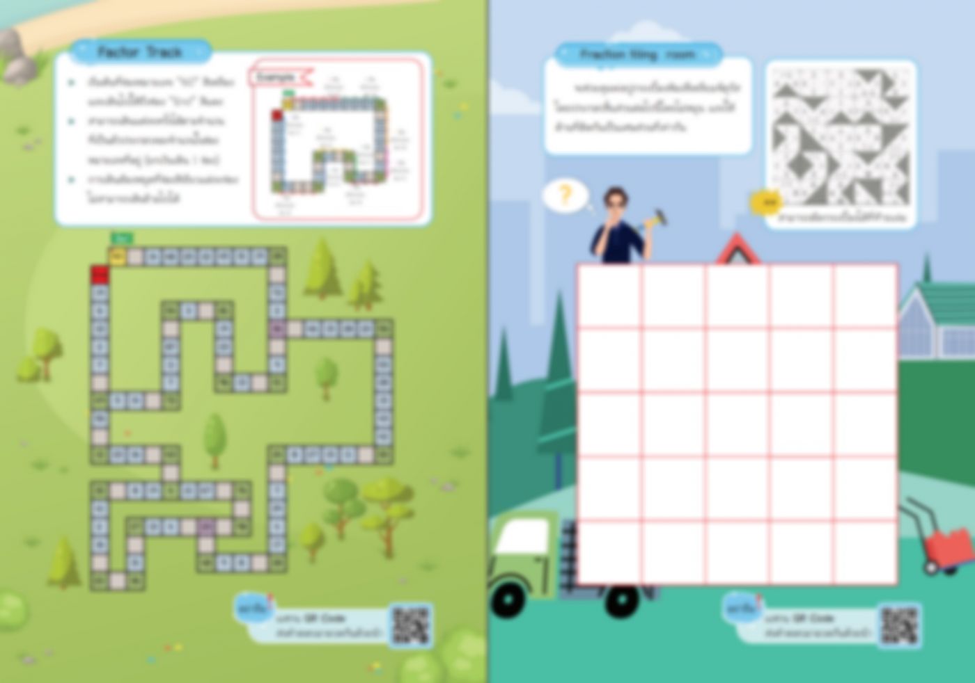 นอกจากนี้ฉันยังได้รับมอบหมายให้ออกแบบหน้า Active Learning อีกด้วย ตำราที่ทีม CC รับผิดชอบส่วนใหญ่จะเป็นตำราที่ใช้ควบคู่กับคอร์สเรียน ภายในเล่มจึงมี Text ไม่เยอะมาก มีการวางเรื่องราว ธีม ตัวละคร และออกแบบให้เด็ก ๆ ไม่เบื่อ ความท้าทายที่เพิ่มมากขึ้นคือหน้า Active Learning จะมาในรูปแบบเกม มีทั้งเกมเติมคำ เกมเขาวงกต เกมตัดกระดาษ บางครั้งจึงต้องทำส่วนเหล่านี้ขึ้นมาเอง เช่น เกมปูกระเบื้อง ซึ่งเด็ก ๆ จะต้องตัดกระดาษที่มีตัวเลขไปปูเรียงตามโจทย์ ฉันก็ใช้วิธีสร้างสี่เหลี่ยมขึ้นมาแล้วค่อย ๆ วางทีละแผ่น ซึ่งส่วนนี้พี่นัทกำชับมาว่าขอให้กระเบื้องเท่ากัน เนื่องจากเป็นตำราของเด็กประถมฯ จึงต้องละเอียดเป็นพิเศษ