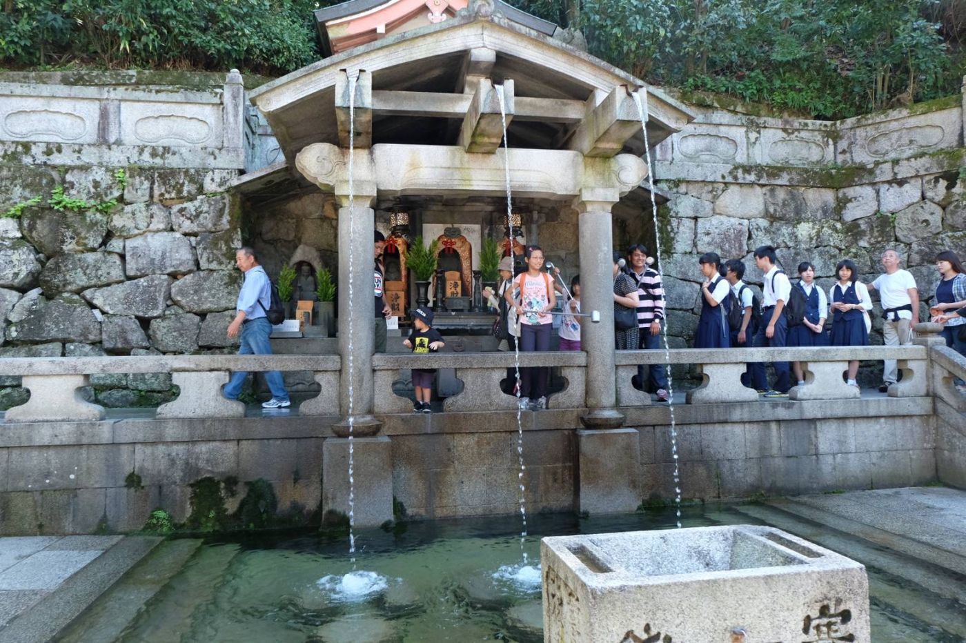 วัดคิโยมิสึ หรือวัดน้ำใสแบบที่คนไทยเรียกกัน แม่น้ำ 3 สายให้พรที่ต่างกัน (แต่ขอโทษทีจำไม่ได้จริงๆ ว่าอะไรบ้าง) เรามันคนโลภอยากจะเอาทั้ง 3 สายแต่ก็เกรงใจคนที่ต่อแถวมาก เลยได้จังหวะสายไหนว่างก่อนก็เอาสายนั้นแหละ เรียกว่ารับพรแบบสุ่ม วัดนี้บริเวณกว้างขวาง คนก็เยอะมากเลยล่ะ มีนักเรียนมาทัศนศึกษาเป็นกลุ่มหลายคน และคนลุงตากล้องที่เหมือนจะมาถ่ายภาพเป็นงานอดิเรก เดินชมรอบๆ บริเวณวัดได้สบายเพราะอากาศกำลังดี เหมาะกับการเดินเล่นดูผู้คนมากๆ และวัดนี้ทั้งคนญี่ปุ่นและชาวต่างชาตินิยมสวมชุดยูกาตะแบบญี่ปุ่นเดินชมวัด เห็นแล้วน่ารักจนต้องขอเข้าไปถ่ายภาพ