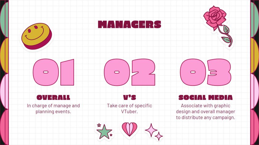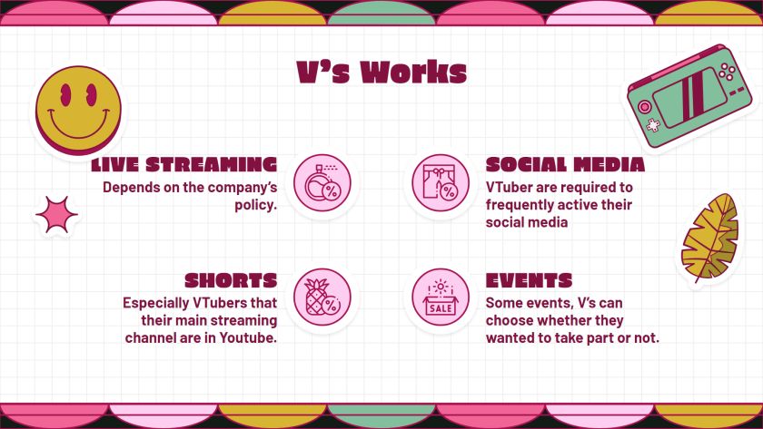ซึ่งแต่ละตำแหน่งจะมีงานของตนเอง เราจะพูดถึงตัวอย่างงานแบบภาพรวมนะคะ งานที่เริ่มแรกและมีความจำเป็นคือการวางแผนในการทำงานเพื่อบรรลุเป้าหมาย รู้ตำแหน่งงานของตนเอง และตรวจสอบผลของการทำงานเพื่อพัฒนาต่อไปค่ะ ซึ่งการทำงานเบื้องหลังนี้ก็จะมีตั้งแต่การสร้างคาแรคเตอร์ของวีทูป ยูนิต การหาแพลตฟอร์มที่เหมาะสมต่อการโปรโมทและการเผยแพร่ การเสนองาน การคัดเลือกผู้ที่จะมาเป็นวีทูปเบอร์ การออกสินค้าและวางแผนการตลาด การจัดงานอีเว้นท์ เป็นต้น