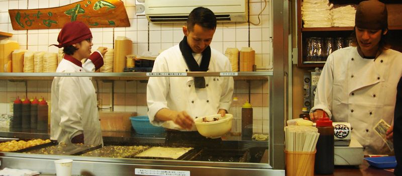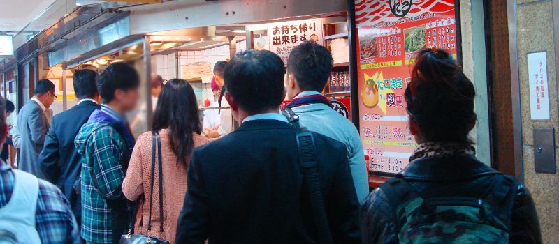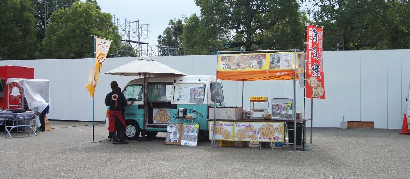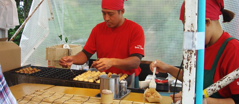 แถวนั้นมีแผงขายของทานหลายอย่าง รวมทั้งทาโกะยากิ