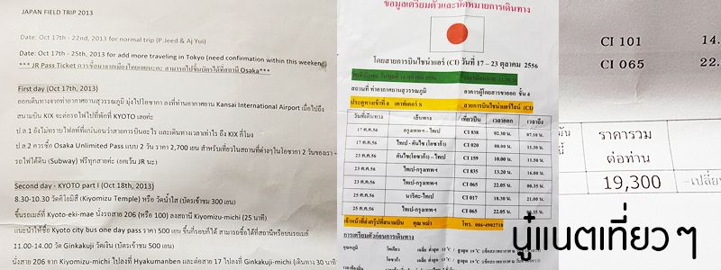 ความจริงไปค้นเอกสารเก่าๆ ในทริปนี้ที่เก็บไว้ก็เจอแพลนการท่องเที่ยวและรายละเอียดตั๋วเครื่องบิน ซึ่งความจริงลืมไปแล้ว ซึ่งแพลนการเดินทางก็จัดโดยอาจารย์ยุ้ยและพี่จี๊ดตามที่ระบุไว้ในใบทริป แต่ตอนจัดก็จำได้ว่าแบบให้เสนอกันว่าอยากไปไหนบ้าง เราก็ตามๆ เขาไปแต่ก็มีเสนอบ้าง ส่วนมากเขาไลน์กลุ่มแต่เราไม่มีมือถือที่เล่นเนตและไลน์ได้ตอนนั้น ตามแค่ใน Facebook