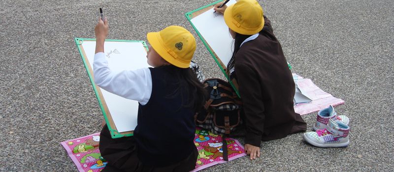 น้องนักเรียนมานั่งวาดรูปกัน ปูเสื่อพร้อมกระดานวาดรูป บางคนนั่งเดี่ยว บางคนนั่งเป็นกลุ่ม