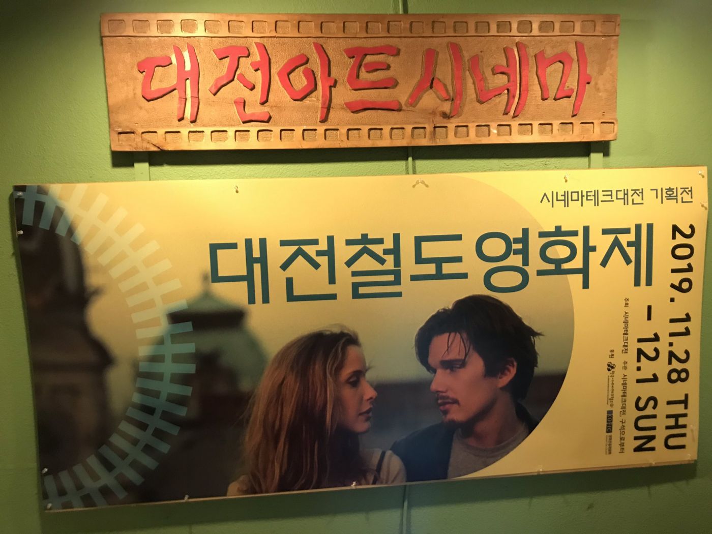 ด้วยความที่เราเป็นคนที่ชอบดูหนังเวลาอยู่ที่ไทยว่างเมื่อไหร่ก็จะหาเวลาเข้าโรงหนังไม่ก็นอนดูเน็ตฟลิกที่บ้าน ดังนั้นตอนนี้ถึงแม้ว่าเราจะอยู่ที่เมืองแดจอน ประเทศเกาหลี เราก็ไม่พลาดที่จะไปแวะเวียนโรงหนังของที่นี่ แต่กับเทศกาลหนังสำหรับเราเป็นประสบการณ์ที่ใหม่มากเพราะอยู่ไทยน้อยครั้งมากที่เราจะไปเทศกาลหนัง จุดเริ่มต้นของการไปเทศกาลหนัง Daejoen cine rail festival 2019 เกิดจากเรารู้จักน้องคนไทยที่เรียนด้านมีเดียมอข้างๆน้องเรียนเกี่ยวกับการทำหนังพอรู้ว่าเราชอบดูหนังเลยมาชวนไปงานนี้ เทศกาลนี้จัดขึ้นโดยDaejeon Art Cinema ซึ่งเป็นโรงหนังขนาดเล็กๆในเมืองนี้ที่ฉายหนังนอกกระแสทั้งเก่าและใหม่มาฉาย ทั้งหนังเกาหลีและหนังต่างชาติ(ซับเกาหลี)