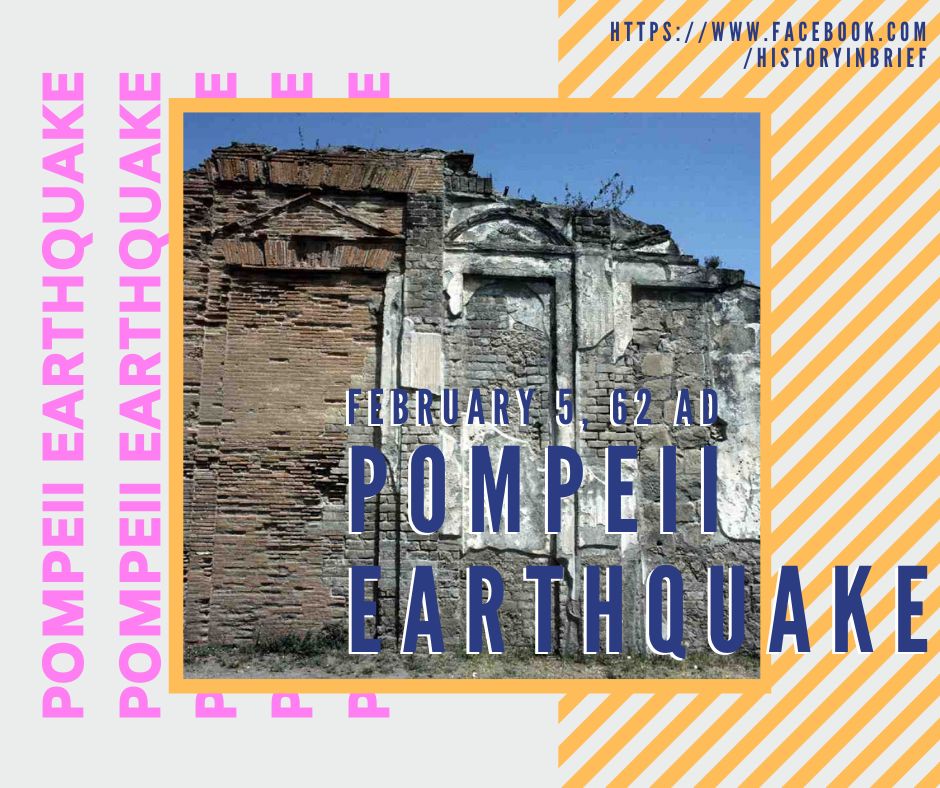 วันที่ 5 กุมภาพันธ์ 62 เกิดเหตุแผ่นดินไหวที่เมืองปอมเปอี และเมืองเฮอร์คิวลาเนียม ที่อยู่ใกล้เคียง เหตุการณ์ครั้งนี้เป็นปฐมบทของเหตุการณ์ภูเขาไฟวิซูเวียสจะระเบิดในปี 79 และส่งผลให้เมืองปอมเปอีจมลงใต้กองลาวามหาศาล