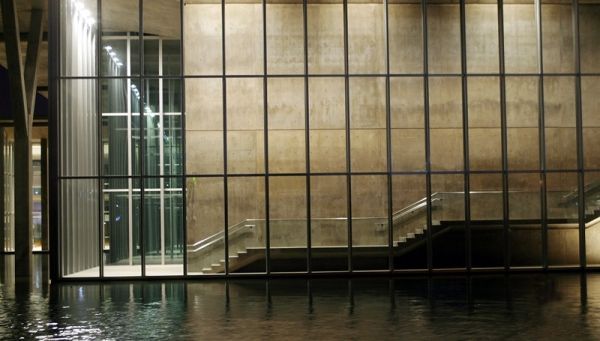 สถาปัตยกรรม ตัวอาคารใช้กระจกเป็นผนัง ไม่ใช้ผนังทึบเเบ่งขอบเขตระหว่างภายใจเเละภายนอก ทำให้ในเวลาเปิดไฟตัวเเสงตกกระทบกับน้ำ สร้างให้เกิดภาพเป็นสถาปัตยกรรมดูเหมือนลอยอยู่บนสระน้ำที่ล้อมรอบ