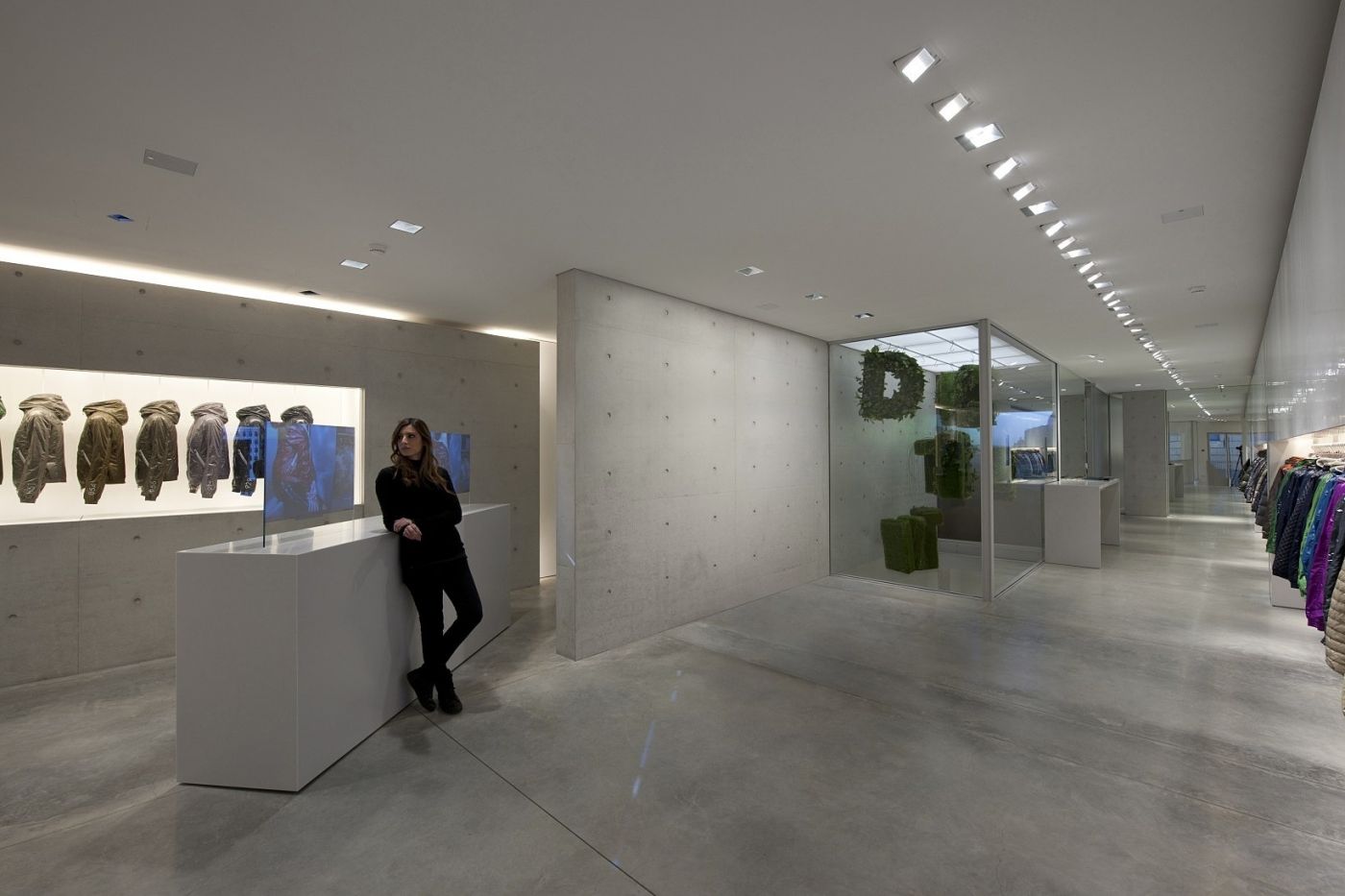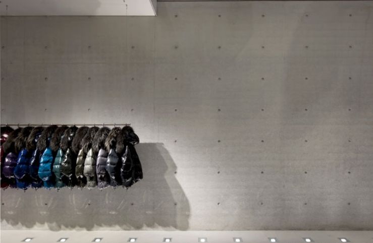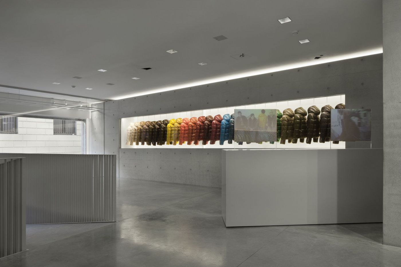 ช่องเเนวนอนเปิดเข้าไปในผนังคอนกรีตมีเสื้อเเจ็คเก็ตจัดวางเรียงกันเป็นเหมือนผลงานศิลปะ เเละนำเสนอรูปแบบสีสันสดใสเเสดงถึงภาพลักษณ์ของเเบรนด์