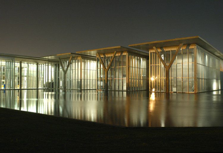 ศาลาหลังคาแบนยาว 5 หลังดูเหมือนลอยอยู่บนยอดบ่อสะท้อนแสงขนาด 1.5 เอเคอร์ พิพิธภัณฑ์สร้างด้วยคอนกรีตเหล็กอะลูมิเนียมแก้วและหินแกรนิตสะท้อนในสระน้ำโดยรอบ