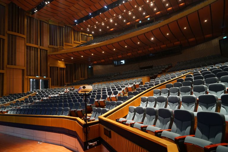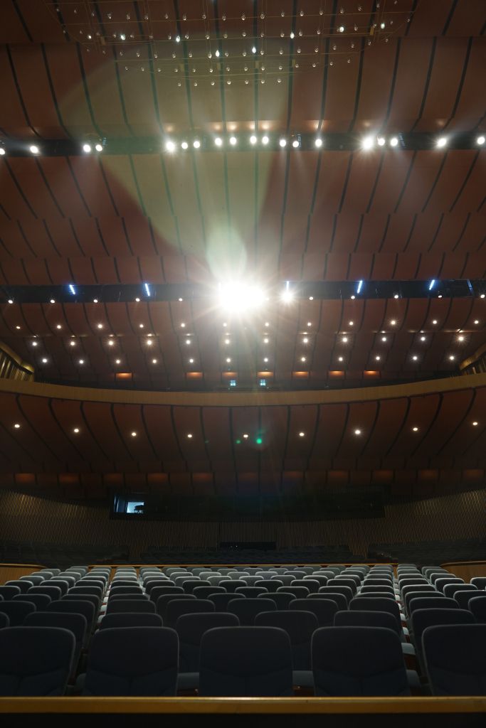 ส่วนบริเวณที่นั่งชม จะใช้แสง วอมไลท์ เพื่อให้ผู้ชมรู้สึกผ่อนคลายและสบายตา เวลาที่เริ่มจัดแสดงงานก็สามารถลดความสว่างลง เพื่อให้ผู้ชม สนใจบน เวที่ได้ ซึ่งหลอดไฟที่ใช้ บริเวณที่นั่งเป็นหลอดไฟที่กระจายแสงได้ดี ทำให้ผู้ชมไม่แสบตา ในเวลาปรับแสง และ ความสว่างบริเวณทางเดิน จะมีแสงที่มากกว่า ที่นั่งชมเพื่อ ลด อุบัติเหต ในการสัญจร