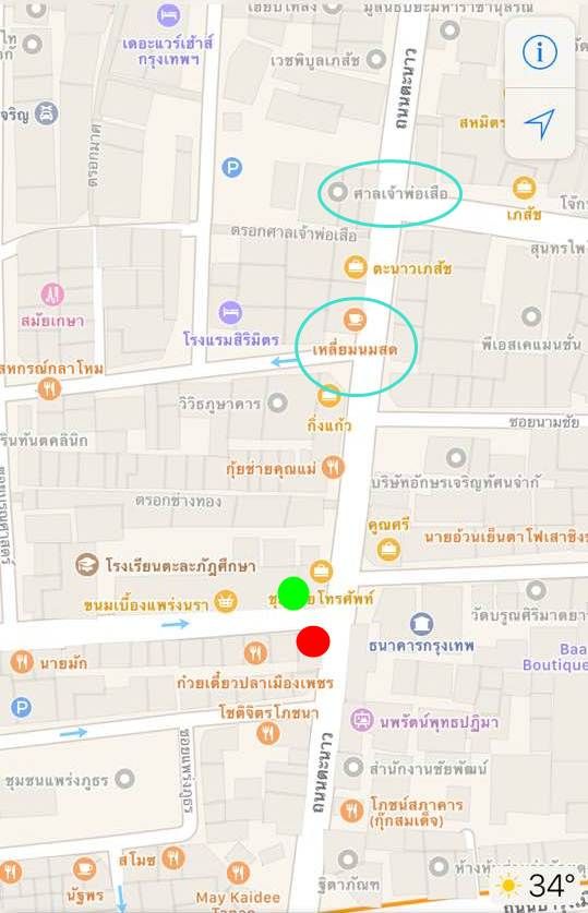 ร้านเหลี่ยมนมสด / จุดแดง = ร้านบะหมี่ปู / จุดเขียว = ร้านมิลล์นมสด